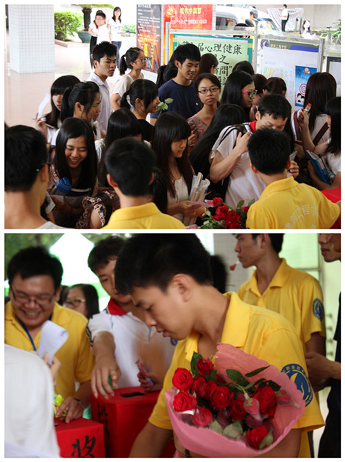 "贈人玫瑰、手有余香",工作人員為投票的師生贈送玫瑰,將幸福傳遞給每一位師生,將我們"陽光建筑、陽光心理"的工作理念傳遞出去,促進學(xué)生的健康成長,共同建設(shè)幸福校園。