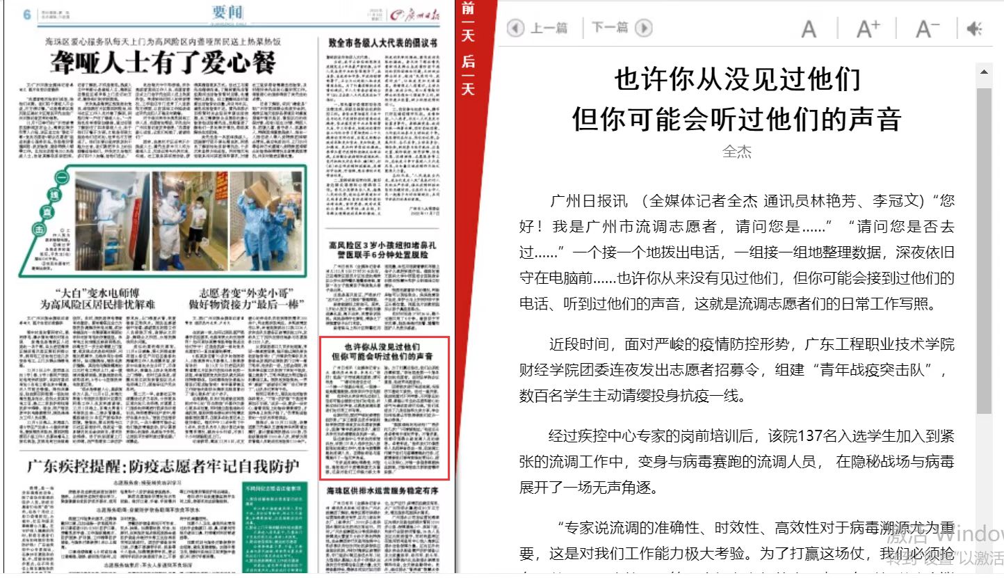 廣州日報的報道中寫道:“也許你從未見過面,但可能聽過他們的聲音,志愿者們與病毒賽跑,和疫情搶時間,克服了各種困難,為早一步完成流調(diào)就能早一步抑制病毒傳播的風(fēng)險而努力,贊揚財經(jīng)學(xué)院志愿者以實際行動彰顯新時代大學(xué)生的精神風(fēng)貌。”