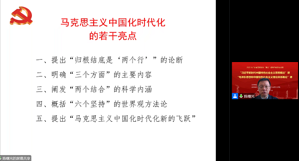教育部高校思政課教學(xué)指導(dǎo)委員會(huì)副主任委員、教育部首屆青年“長(zhǎng)江學(xué)者”、中共中央黨校(國(guó)家行政學(xué)院)馬克思主義學(xué)院副院長(zhǎng)陳曙光教授作題為《 “黨的二十大報(bào)告”對(duì)習(xí)近平新時(shí)代中國(guó)特色社會(huì)主義思想的新發(fā)展》的主題報(bào)告。他從“歸根到底是‘兩個(gè)行’的論斷、‘三個(gè)板塊’的主要內(nèi)容、‘兩個(gè)結(jié)合’的根本途徑、‘六個(gè)堅(jiān)持’的世界觀方法論、馬克思主義中國(guó)化時(shí)代化新的飛躍”等五個(gè)方面深入解讀“開(kāi)辟了馬克思主義中國(guó)化時(shí)代化新境界”這一重要論斷。