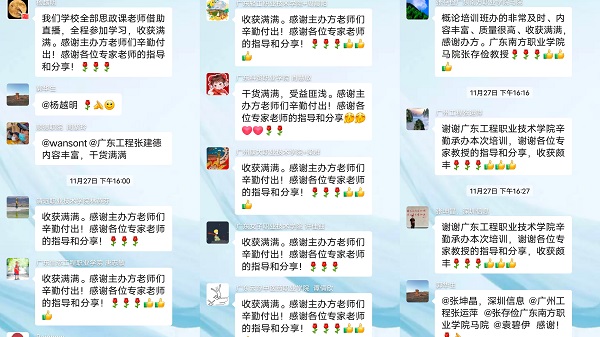 本次培訓(xùn)主題鮮明,內(nèi)容豐富,議程合理,獲得參會(huì)領(lǐng)導(dǎo)、教師高度好評(píng)。參會(huì)教師紛紛表示,專家的報(bào)告視野開(kāi)闊、系統(tǒng)深入、精辟透徹,教學(xué)能手的教學(xué)展示內(nèi)涵深刻、生動(dòng)形象,入情入理,整個(gè)培訓(xùn)緊緊圍繞黨的二十大報(bào)告的理論創(chuàng)新點(diǎn)和學(xué)術(shù)熱點(diǎn),直面解決“概論”課教學(xué)中的重難點(diǎn)問(wèn)題,對(duì)于“概論”課教師如何能更好地適應(yīng)新形勢(shì)新內(nèi)容新要求,把握教育教學(xué)規(guī)律,完整、準(zhǔn)確、全面把黨的二十大精神有機(jī)融入思政課教育教學(xué),講準(zhǔn)、講深、講透、講活馬克思主義中國(guó)化時(shí)代化最新理論成果,具有很強(qiáng)的指導(dǎo)作用。東莞職業(yè)技術(shù)學(xué)院馬克思主義學(xué)院院長(zhǎng)石文斌、惠州工程職業(yè)學(xué)院馬克思主義學(xué)院院長(zhǎng)理陽(yáng)陽(yáng)、廣州科技貿(mào)易職業(yè)學(xué)院馬克思主義學(xué)院院長(zhǎng)丁西泠有針對(duì)性的開(kāi)展了精準(zhǔn)點(diǎn)評(píng),并以問(wèn)題意識(shí)為導(dǎo)向,就如何把黨的二十大精神融入到思政課教學(xué)中做了科學(xué)具體的指導(dǎo)。
