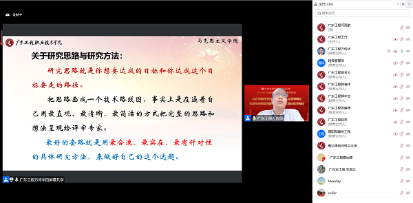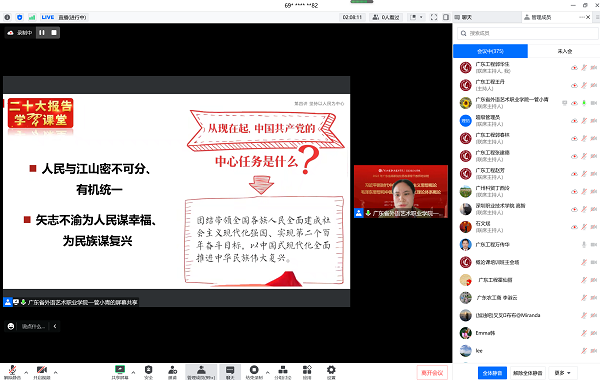 11月26至27日,由廣東省教育廳主辦、我校馬克思主義學(xué)院承辦的2022年度廣東省高職院校“習(xí)近平新時(shí)代中國(guó)特色社會(huì)主義思想概論”課、“毛澤東思想和中國(guó)特色社會(huì)主義理論體系概論”課(以下簡(jiǎn)稱“概論”課)骨干教師培訓(xùn)班成功舉辦。本次培訓(xùn)依托騰訊會(huì)議APP,以線上會(huì)議和在線直播方式來(lái)進(jìn)行。來(lái)自全省高職院校近600名“概論”課骨干教師云端相聚,在線研討,同頻研課,凝心聚力,在全面學(xué)習(xí)、全面把握、全面落實(shí)上下工夫,切實(shí)推動(dòng)黨的二十大精神全面貫穿融入思政課,有力有效推動(dòng)黨的二十大精神在師生心中落地生根。