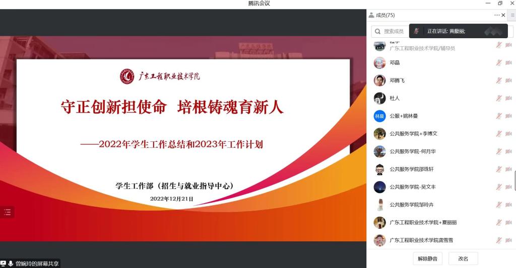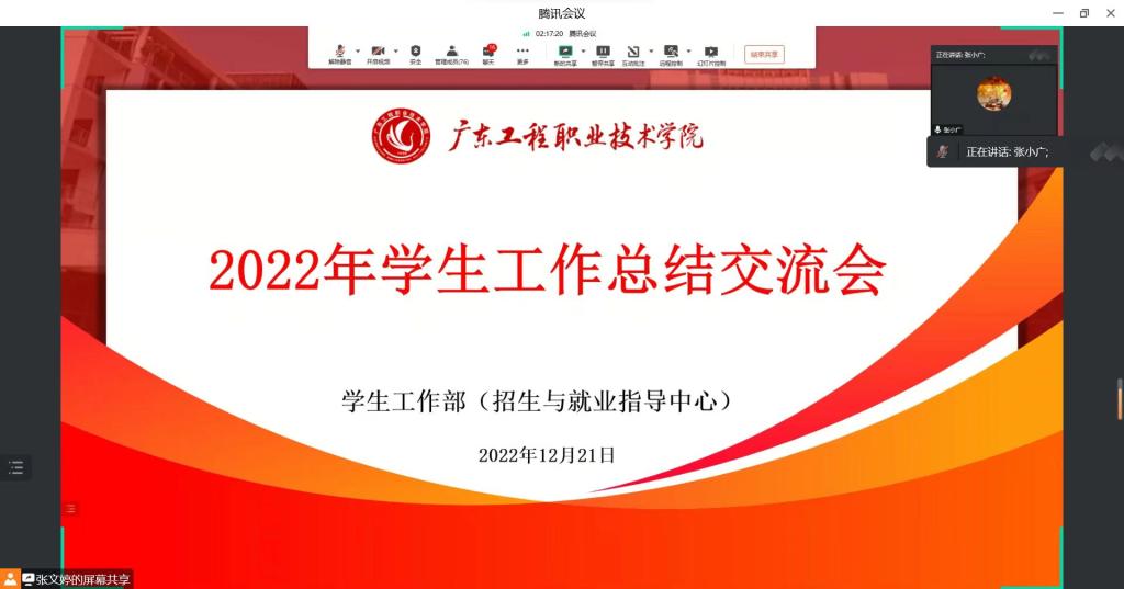 12月21日上午,學生工作部(招生與就業(yè)指導中心)召開2022年學生工作總結交流會,學校副校長張小廣出席會議并講話,學生工作部(招生與就業(yè)指導中心)全體人員、各二級學院黨總支副書記及全體輔導員參會,學生工作部部長黃馥麗主持會議。