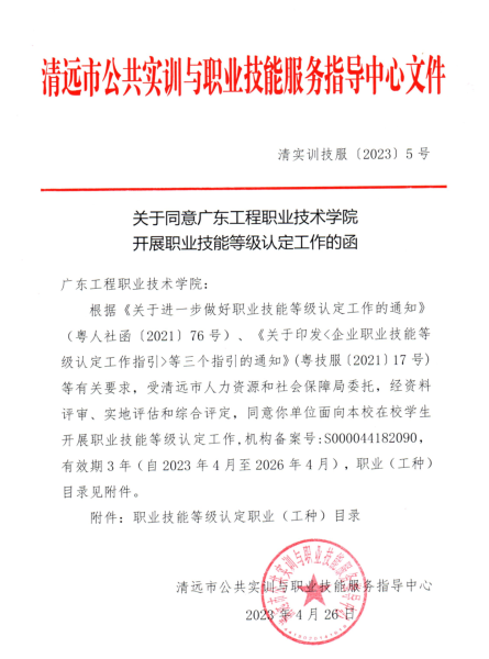 經(jīng)資料評審、實地評估和綜合評定,清遠市人力資源和社會保障局同意廣東工程職業(yè)技術(shù)學院等4所院校為清遠市院校職業(yè)技能等級認定機構(gòu),可面向本校在校學生開展職業(yè)技能等級認定;同意我校增加認定20個工種范圍。