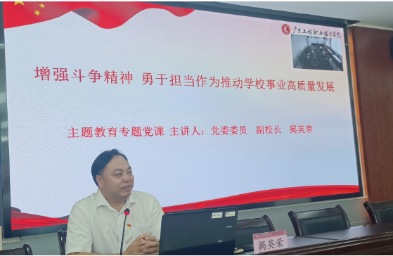 隨后,揭英榮副校長圍繞增強斗爭精神,勇于擔當作為,推動學校事業(yè)高質量發(fā)展展開主題教育專題黨課;主要圍繞“什么是斗爭精神,為什么要發(fā)揚斗爭精神,怎樣發(fā)揚斗爭精神”進行了講授;并結合學校實際就“發(fā)揚斗爭精神,勇于擔當善于作為,推動學校事業(yè)高質量發(fā)展”進行了專題輔導。揭英榮強調,學校歷經(jīng)65年的發(fā)展,經(jīng)過幾屆班子和全體教職工的團結奮斗,不斷破解了發(fā)展的瓶頸,加強黨的全面領導培養(yǎng)了能干事、敢干事、干成事的干部隊伍,進駐省職教城拓展了辦學空間,加強內控建設強化了學校良性運轉基礎,強化黨的監(jiān)督涵養(yǎng)了風清氣正的干事創(chuàng)業(yè)生態(tài),抓擴招擴規(guī)模積累了辦學資源,等等,這些都為我們高質量發(fā)展打下了堅實的基礎。但是,我們也清醒地看到,學校的辦學經(jīng)費還比較緊缺、高層次人才儲備還不足、信息化水平還不高、內涵建設還不夠強、標志性成果還不突出、校園建設和服務保障還有較大提升空間等。因此,在實際工作中,還須我們進一步發(fā)揚斗爭精神,敢于擔當作為。