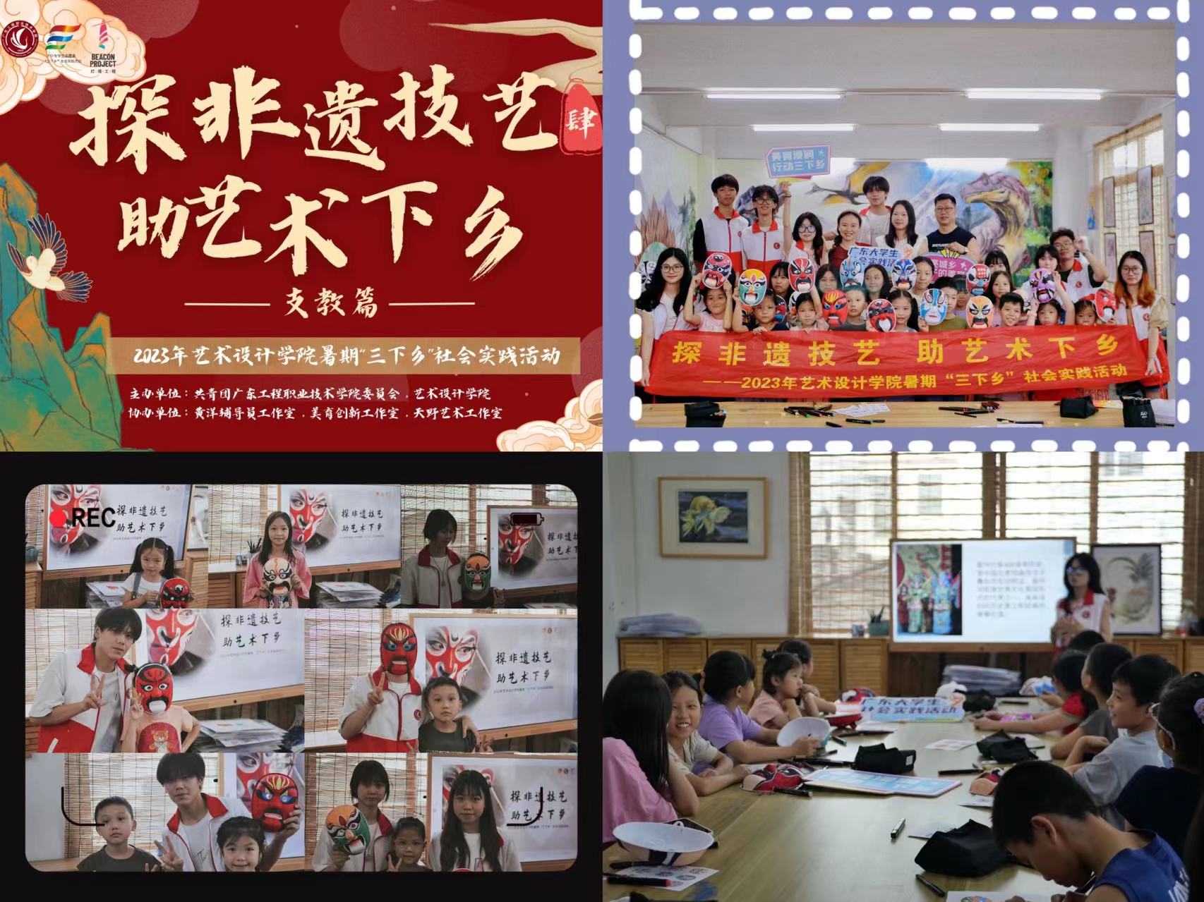 為守住優(yōu)秀傳統(tǒng)文化根脈,將優(yōu)秀傳統(tǒng)文化尤其是非遺文化廣泛普及傳承,推進(jìn)鄉(xiāng)村教育繁榮,引導(dǎo)大學(xué)生在實(shí)踐中體悟工匠情懷,激發(fā)青春力量的使命擔(dān)當(dāng), 2023年8月15日,我院“向美而行”實(shí)踐團(tuán)在澄海東里鎮(zhèn)開(kāi)展了以潮汕非遺傳統(tǒng)文化為主題的實(shí)踐活動(dòng)。精心打造非遺特色課堂,帶領(lǐng)東里鎮(zhèn)的孩子們感受傳統(tǒng)文化的魅力。活動(dòng)現(xiàn)場(chǎng),實(shí)踐隊(duì)員利用PPT作為課堂切入點(diǎn)向小朋友們介紹了潮劇的起源和發(fā)展,讓小朋友們了解潮劇的重要地位以及行當(dāng)分類,增強(qiáng)小朋友們對(duì)戲劇傳統(tǒng)文化的興趣。通過(guò)本次藝術(shù)繪畫臉譜活動(dòng),孩子們初步了解了臉譜藝術(shù)的特點(diǎn)、色彩等基礎(chǔ)知識(shí)。親身體驗(yàn)?zāi)樧V制作讓他們感受了中國(guó)傳統(tǒng)文化的魅力,寓教于樂(lè),樂(lè)在其中!培養(yǎng)了小朋友們對(duì)臉譜藝術(shù)的鑒賞能力,在實(shí)踐中了解非遺、熱愛(ài)非遺,更讓大家親身感受了中華傳統(tǒng)文化藝術(shù)的魅力,激發(fā)熱愛(ài)傳統(tǒng)文化的情感,增強(qiáng)民族自豪感。