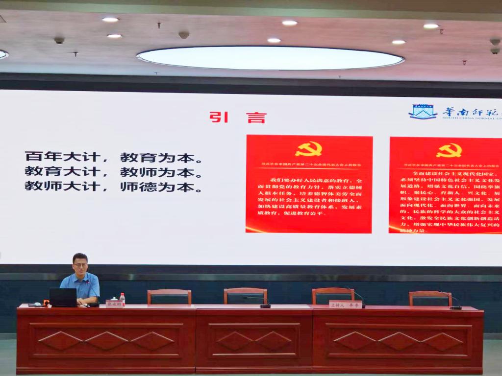 在開(kāi)班儀式后,華南師范大學(xué)馬克思主義學(xué)院張永剛教授為參加培訓(xùn)人員做了以“以立德樹(shù)人鑄就教育之魂”為題的師德師風(fēng)專題培訓(xùn)。