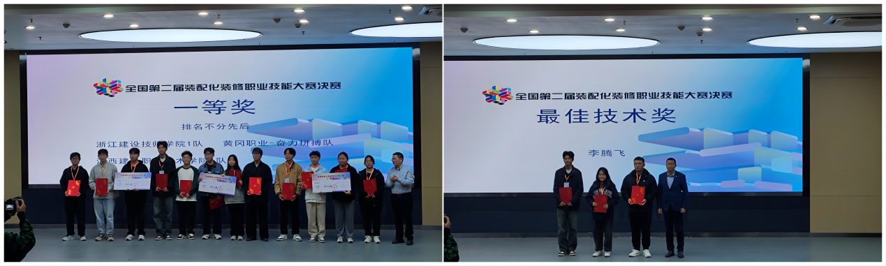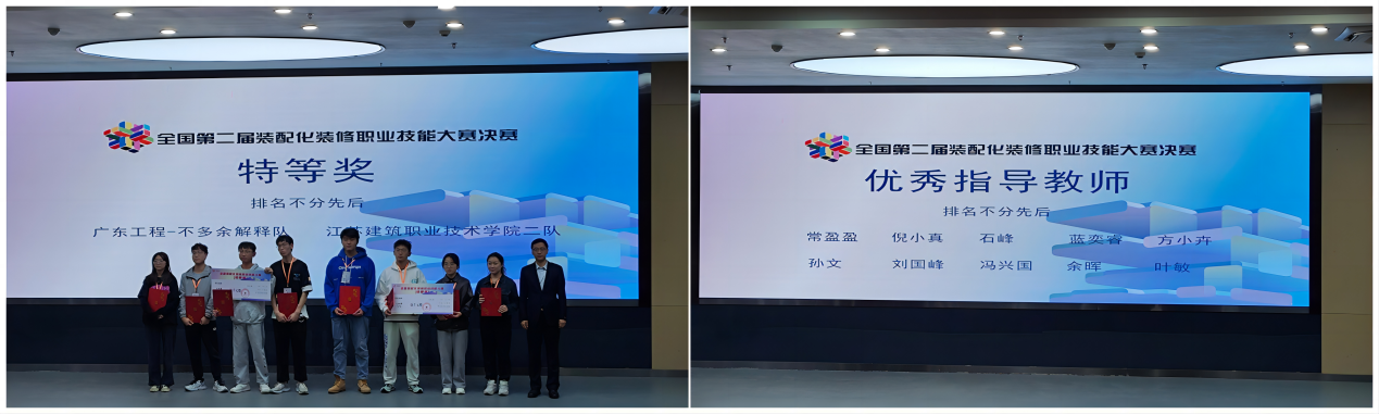 18日下午,學校黨委委員、副校長揭英榮出席了閉幕式。閉幕式上宣布了全國第二屆裝配化裝修職業(yè)技能大賽團隊及個人獲獎名單,廣東工程-不多余解釋隊、江蘇建筑職業(yè)技術(shù)學院二隊獲特等獎、浙江建設(shè)技師學院1隊、黃岡職業(yè)-奮力拼搏隊、江西建設(shè)職業(yè)技術(shù)學院1隊獲一等獎、聊城職業(yè)技術(shù)學院、武漢職業(yè)技術(shù)學院1隊等11支隊伍獲二等獎,其中,獲得團隊特等獎、一等獎參賽隊的10名指導教師榮獲優(yōu)秀指導教師榮譽稱號,本屆比賽還評選了技術(shù)能手獎、最佳工匠獎、最佳設(shè)計獎各1名及企業(yè)特殊貢獻獎等獎項,隨后舉行了隆重的頒獎儀式,并進行下屆大賽賽旗交接儀式。