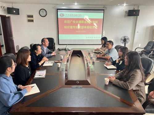 11月20日下午,廣東交通職業(yè)技術(shù)學(xué)院組織宣傳統(tǒng)戰(zhàn)部部長安豐田一行4人到我校調(diào)研交流。黨委委員、組織統(tǒng)戰(zhàn)部部長劉松梅、宣傳部(武裝部)副部長林華開及黨政辦公室曾文等熱情接待了客人。