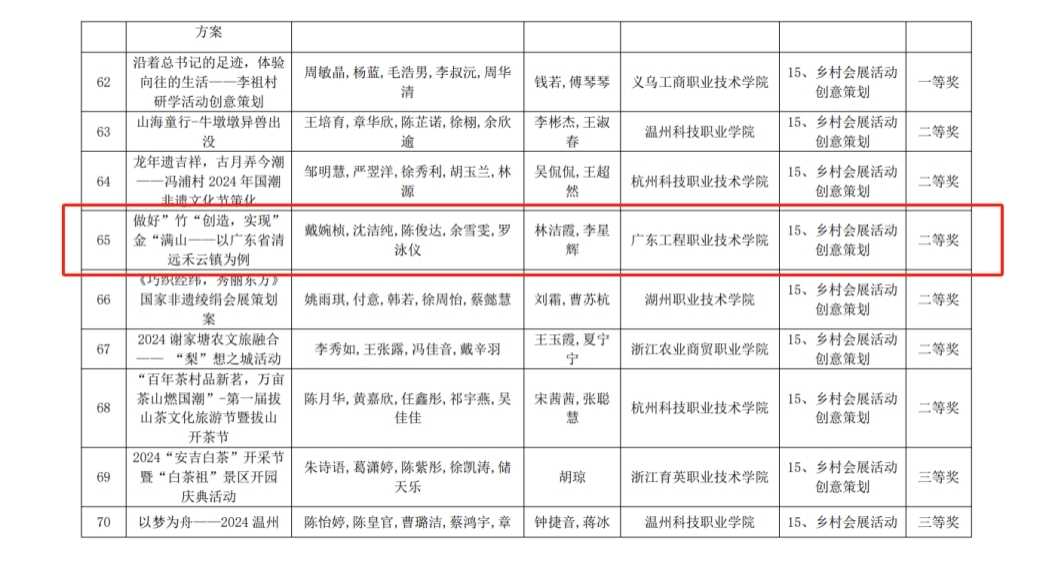 在比賽中,這五名學(xué)生以做好“竹”創(chuàng)造,實(shí)現(xiàn)“金”滿山為題,以廣東省清遠(yuǎn)區(qū)禾云鎮(zhèn)為具體案例,充分發(fā)揮大學(xué)生的自身力量,深入基層,運(yùn)用專業(yè)知識,精心設(shè)計(jì)出一系列獨(dú)特的鄉(xiāng)村會(huì)展活動(dòng)策劃方案。他們致力于將最新的科技、文化、藝術(shù)等元素融入其中,以激發(fā)鄉(xiāng)村的活力,為鄉(xiāng)村振興奉獻(xiàn)力量。我院教師林潔霞、李星輝針對參賽項(xiàng)目進(jìn)行詳細(xì)指導(dǎo),使學(xué)生在大賽中積極進(jìn)取,專業(yè)技能和創(chuàng)新思維都得到了很大提升。