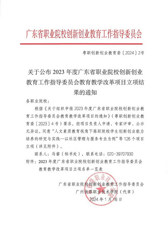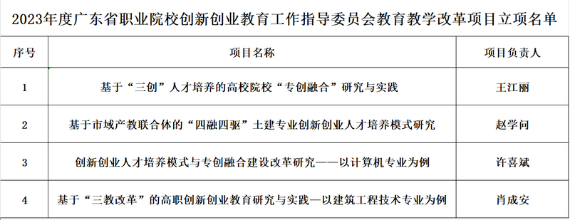近日,廣東省職業(yè)院校創(chuàng)新創(chuàng)業(yè)教育工作指導委員會公布了2023年廣東省職業(yè)院校創(chuàng)新創(chuàng)業(yè)教育工作指導委員會教育教學改革項目立項結果的通知,由我校創(chuàng)新創(chuàng)業(yè)學院組織申報,王江麗老師主持的《基于“三創(chuàng)”人才培養(yǎng)的高校院校“專創(chuàng)融合”研究與實踐》趙學問老師主持的《基于市域產(chǎn)教聯(lián)合體的“四融四驅(qū)”土建專業(yè)創(chuàng)新創(chuàng)業(yè)人才培養(yǎng)模式研究》、許喜斌老師主持的《創(chuàng)新創(chuàng)業(yè)人才培養(yǎng)模式與專創(chuàng)融合建設改革研究——以計算機專業(yè)為例》和肖成安老師主持的《基于“三教改革”的高職創(chuàng)新創(chuàng)業(yè)教育研究與實踐—以建筑工程技術專業(yè)為例》等4項研究項目被確定為2023年廣東省職業(yè)院校創(chuàng)新創(chuàng)業(yè)教育工作指導委員會教育教學改革立項項目。