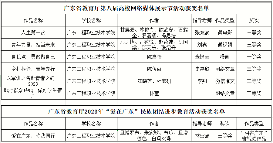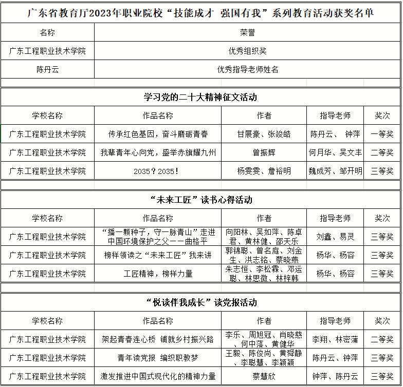 在近期公布的廣東高校多項評比活動中,我校學工團隊斬獲多項榮譽。在由廣東省教育廳主辦的2023年職業(yè)院校“技能成才 強國有我”系列教育活動、“習近平總書記與大學生在一起”學習分享活動暨2023年“立志·修身·博學·報國主題教育系列活動、第八屆高校網(wǎng)絡媒體展示節(jié)活動、2023年“愛在廣東”民族團結(jié)進步教育活動等4類省級系列活動評選結(jié)果中,我校累計榮獲23項省級榮譽,其中學校首次攬獲廣東省2023年職業(yè)院校“技能成才 強國有我”優(yōu)秀組織獎,人工智能輔導員陳丹云獲評為“優(yōu)秀指導老師”。此外其他大賽榮獲一等獎2項、二等獎3項、三等獎16項。