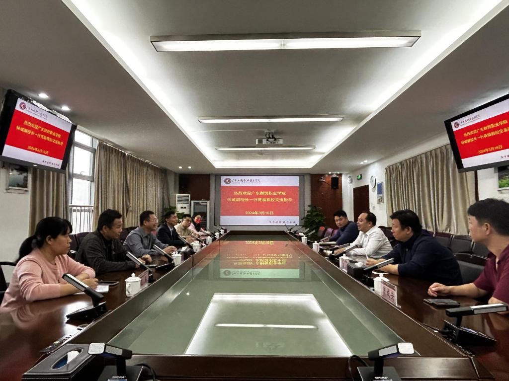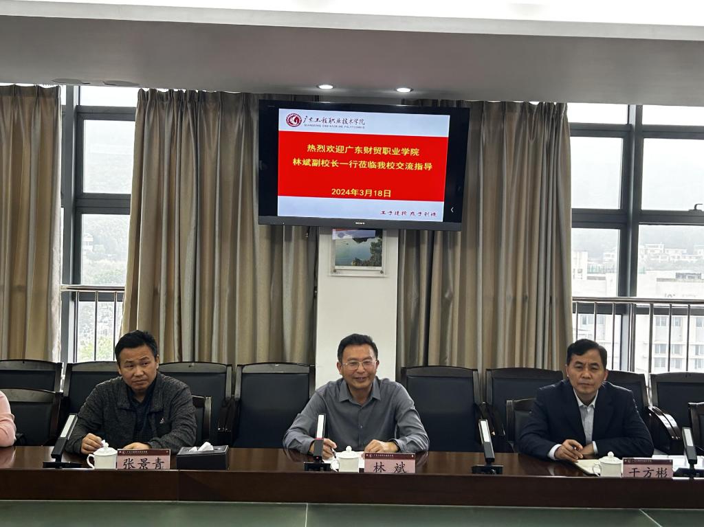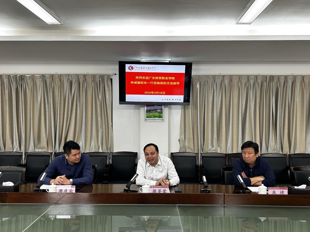 3月18日上午,廣東財(cái)貿(mào)職業(yè)學(xué)院林斌副校長(zhǎng)一行到我校開(kāi)展調(diào)研交流,座談會(huì)在廣州校區(qū) 615 會(huì)議室召開(kāi)。學(xué)校揭英榮副校長(zhǎng)出席交流會(huì),資產(chǎn)設(shè)備部部長(zhǎng)朱靖、總務(wù)后勤部(保衛(wèi)部)負(fù)責(zé)人廖彥云等參加座談會(huì)。座談會(huì)由揭英榮主持