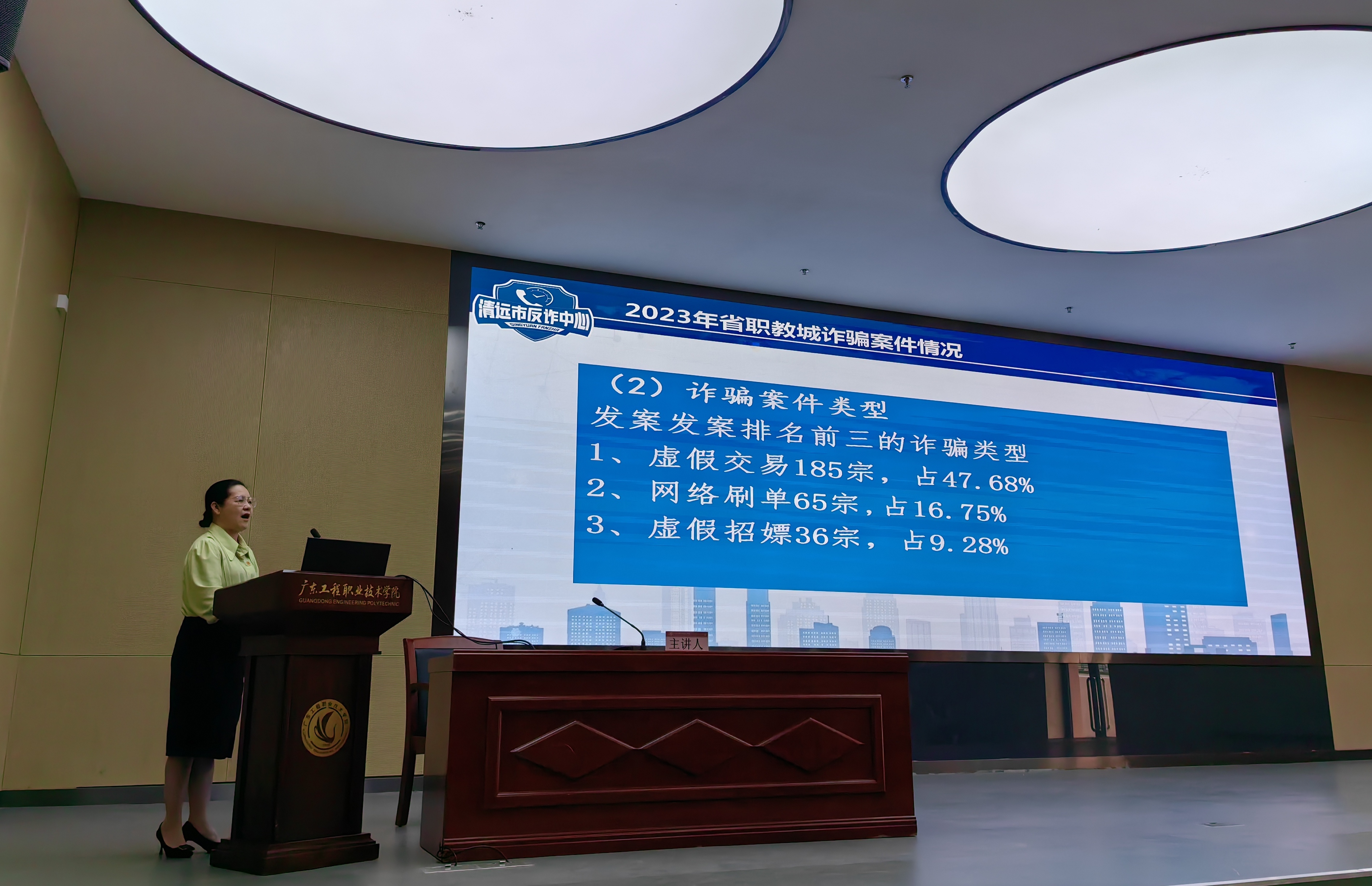 清遠(yuǎn)市公安局反詐宣傳員謝越警官以“全民反詐,你我同學(xué)”為題開展反詐防騙知識(shí)講座,分析了清遠(yuǎn)省職教城嚴(yán)峻的詐騙形勢(shì),結(jié)合典型的詐騙案例,詳細(xì)介紹了網(wǎng)絡(luò)刷單、“殺豬盤”等各種詐騙類型,提醒學(xué)生提高鑒別能力,筑牢個(gè)人安全防線,切實(shí)維護(hù)好自身利益。