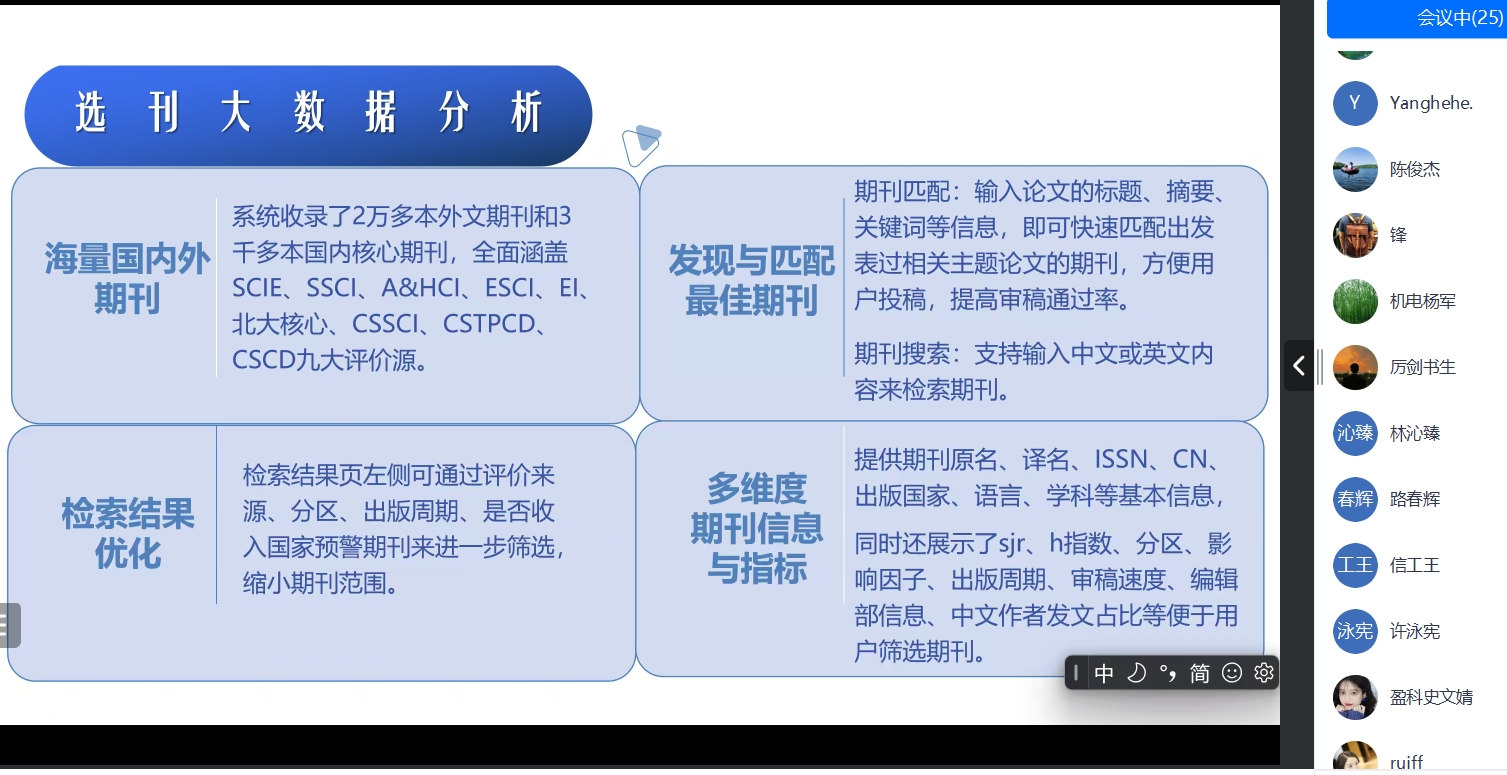 4月29日的中國知網使用指南線上培訓中,中國知網講師肖芳老師結合我校專業(yè)設置和師生讀者使用習慣,重點講解并演示知網知識服務平臺,以及如何利用平臺進行查找資料、具體的檢索技巧分析,高效筆記整理、實用工具利用等問題。培訓內容切合我校讀者的需求,獲得參會讀者的一致好評。