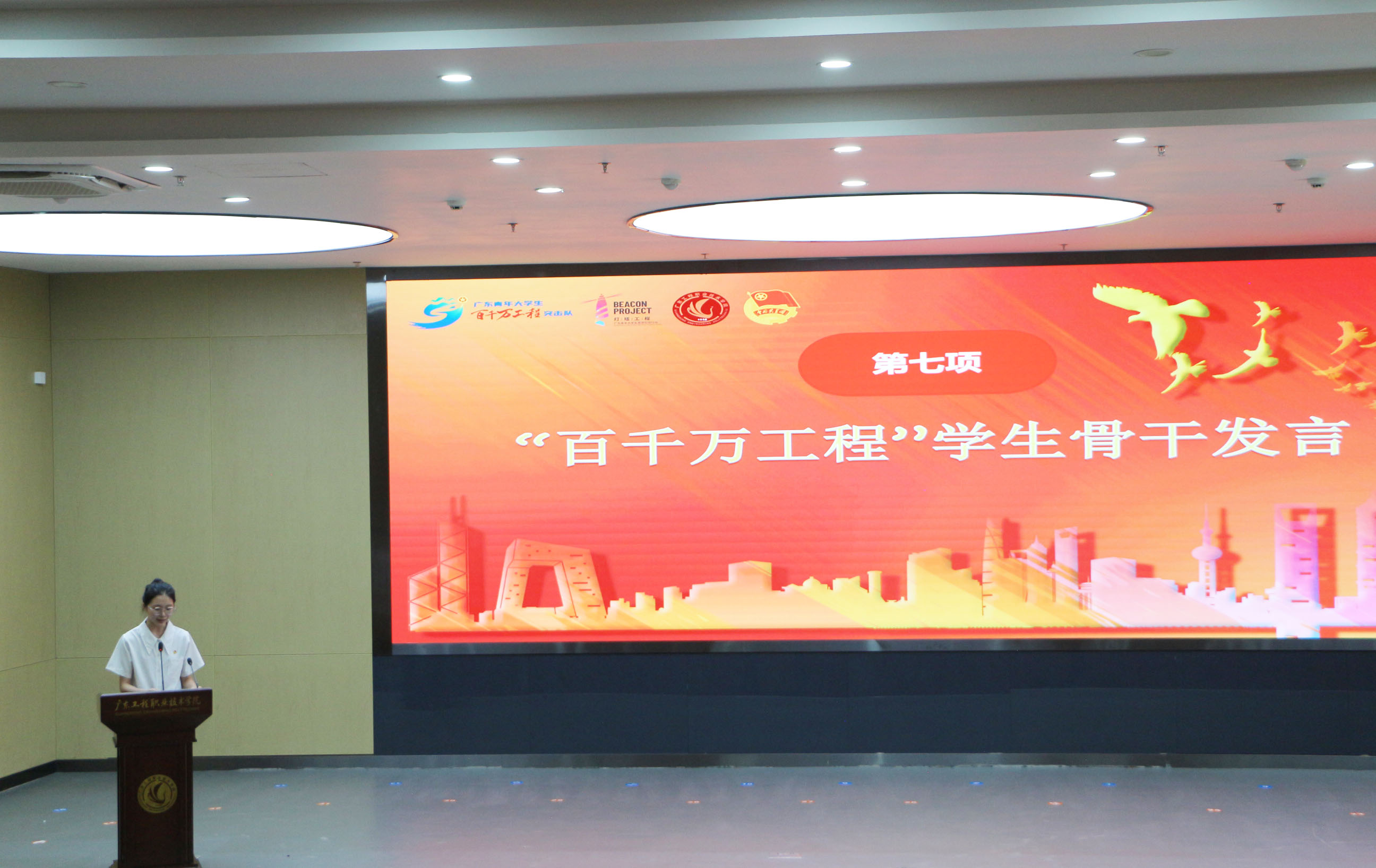 “百千萬工程”突擊隊學(xué)生代表藍子君同學(xué)發(fā)言表態(tài),表示將時刻注意維護工程青年的形象,以認(rèn)真負(fù)責(zé)的態(tài)度全力以赴,體現(xiàn)工程青年的專業(yè)精神和擔(dān)當(dāng)意識,在實踐中要樹立安全第一的意識。用汗水和智慧,在祖國建設(shè)的道路上留下粵工程學(xué)子青春的足跡。