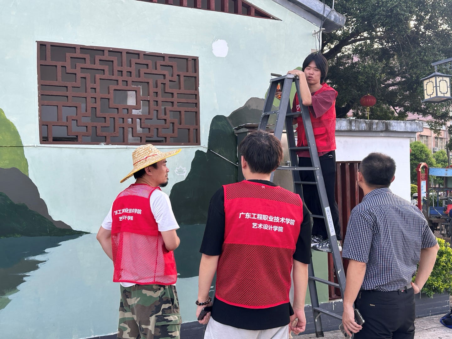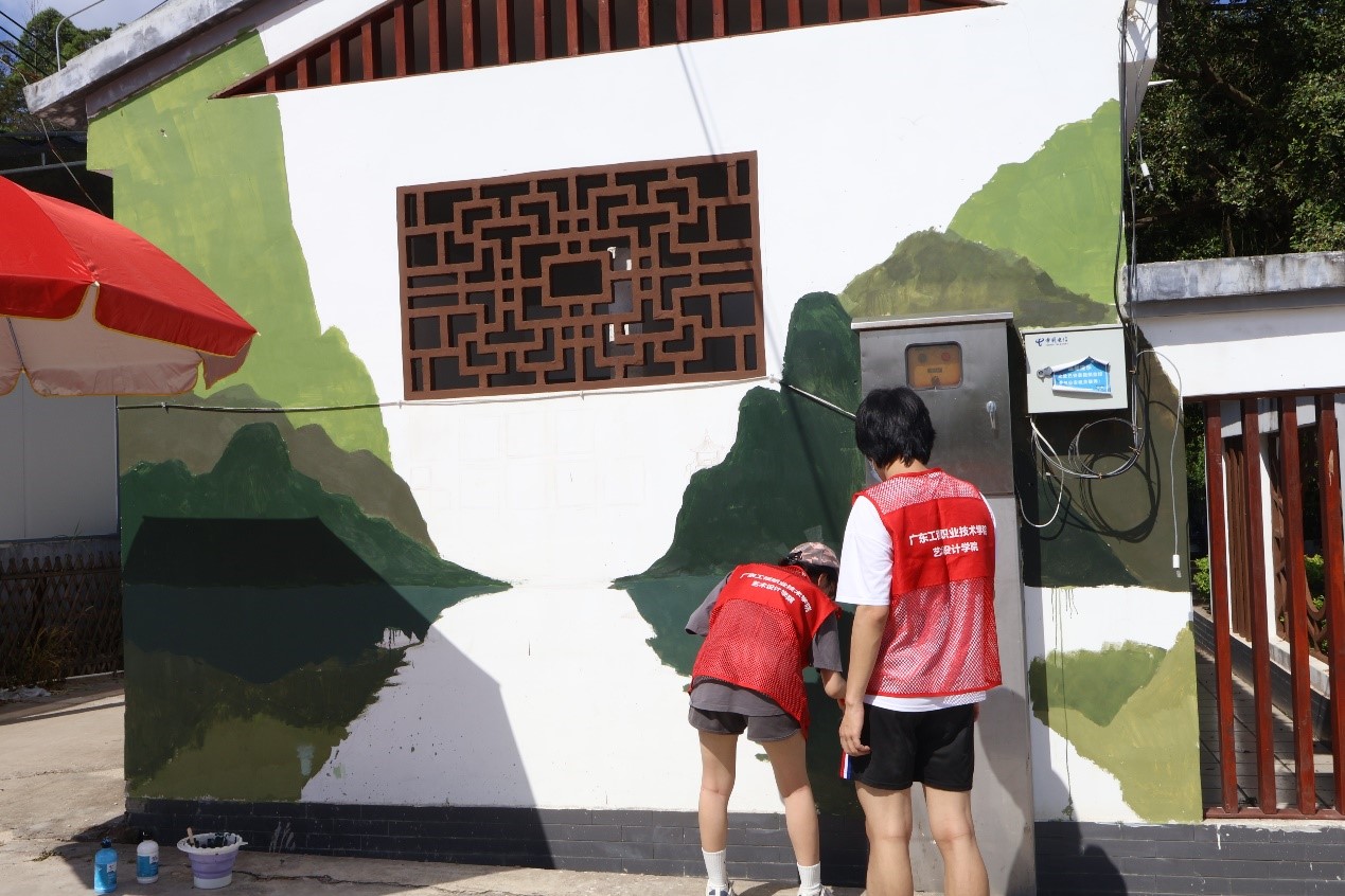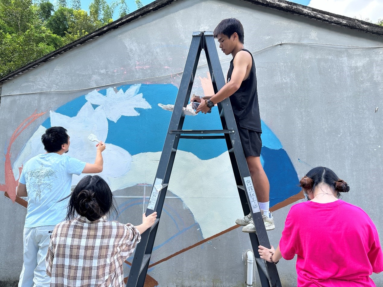 正值炎炎夏日,團(tuán)隊(duì)進(jìn)行了起形、調(diào)色、上色、修形等一系列的墻繪步驟,他們巧妙融合了大畔寮村的自然風(fēng)光、歷史文化和民俗風(fēng)情。墻面上,繪出了青山綠水的優(yōu)美景色,讓人們仿佛置身于大自然的懷抱。在繪畫期間省“雙百行動(dòng)”服務(wù)隊(duì)黎迪斯副隊(duì)長(zhǎng)與指導(dǎo)老師肖飛老師、曾蔚老師、李小能老師進(jìn)行了專業(yè)性的指導(dǎo)與修改,使團(tuán)隊(duì)成員快速的完成了墻繪工作。