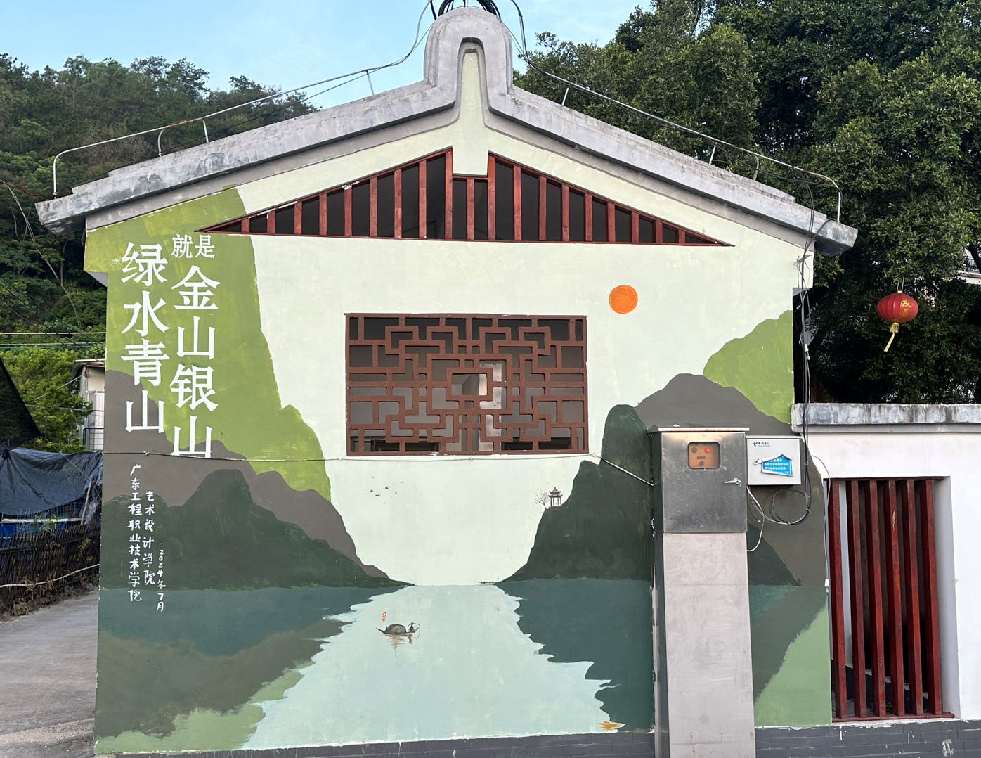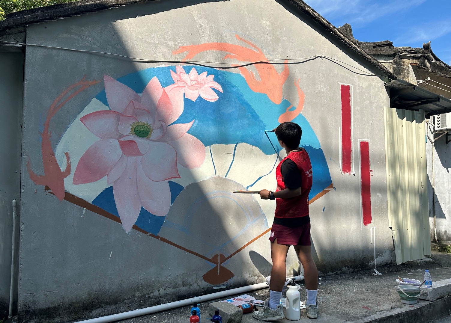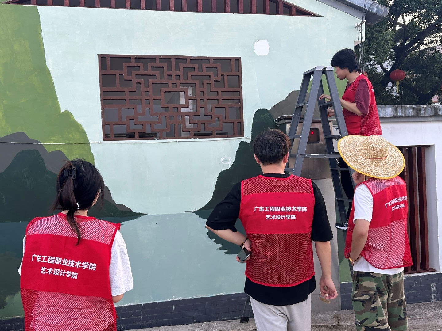 正值炎炎夏日,團(tuán)隊(duì)進(jìn)行了起形、調(diào)色、上色、修形等一系列的墻繪步驟,他們巧妙融合了大畔寮村的自然風(fēng)光、歷史文化和民俗風(fēng)情。墻面上,繪出了青山綠水的優(yōu)美景色,讓人們仿佛置身于大自然的懷抱。在繪畫期間省“雙百行動(dòng)”服務(wù)隊(duì)黎迪斯副隊(duì)長(zhǎng)與指導(dǎo)老師肖飛老師、曾蔚老師、李小能老師進(jìn)行了專業(yè)性的指導(dǎo)與修改,使團(tuán)隊(duì)成員快速的完成了墻繪工作。
