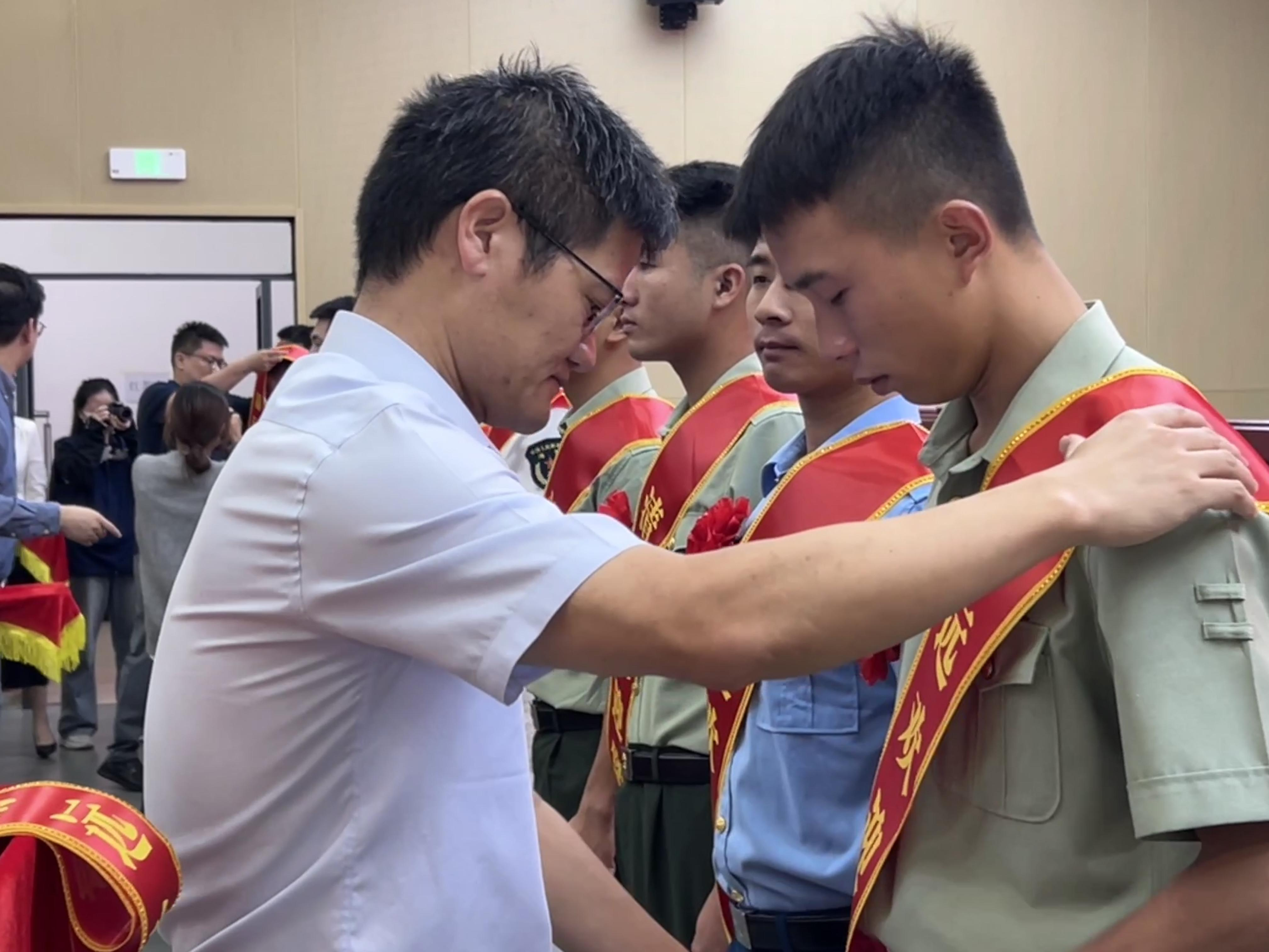 會上,主席臺就座的領(lǐng)導(dǎo)為退役士兵代表佩戴歡迎綬帶,并合影留念。