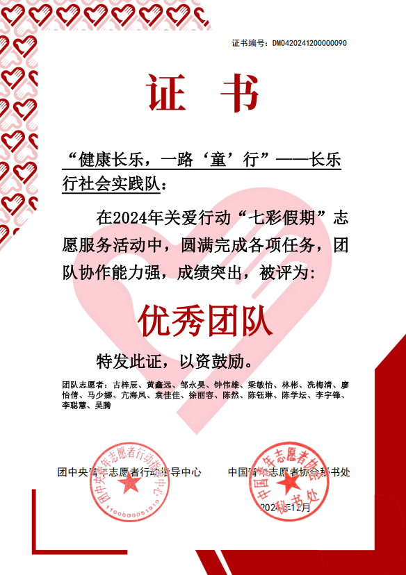 近日,團(tuán)中央和中國青年志愿者協(xié)會聯(lián)合公布了2024年“七彩假期”志愿服務(wù)優(yōu)秀團(tuán)隊評選結(jié)果,由校團(tuán)委組建的“健康長樂,一路‘童’行”——長樂行社會實踐隊獲評優(yōu)秀團(tuán)隊。這是我校深入落實立德樹人根本任務(wù),以黨建引領(lǐng)深化共青團(tuán)實踐育人取得的一項新成果。