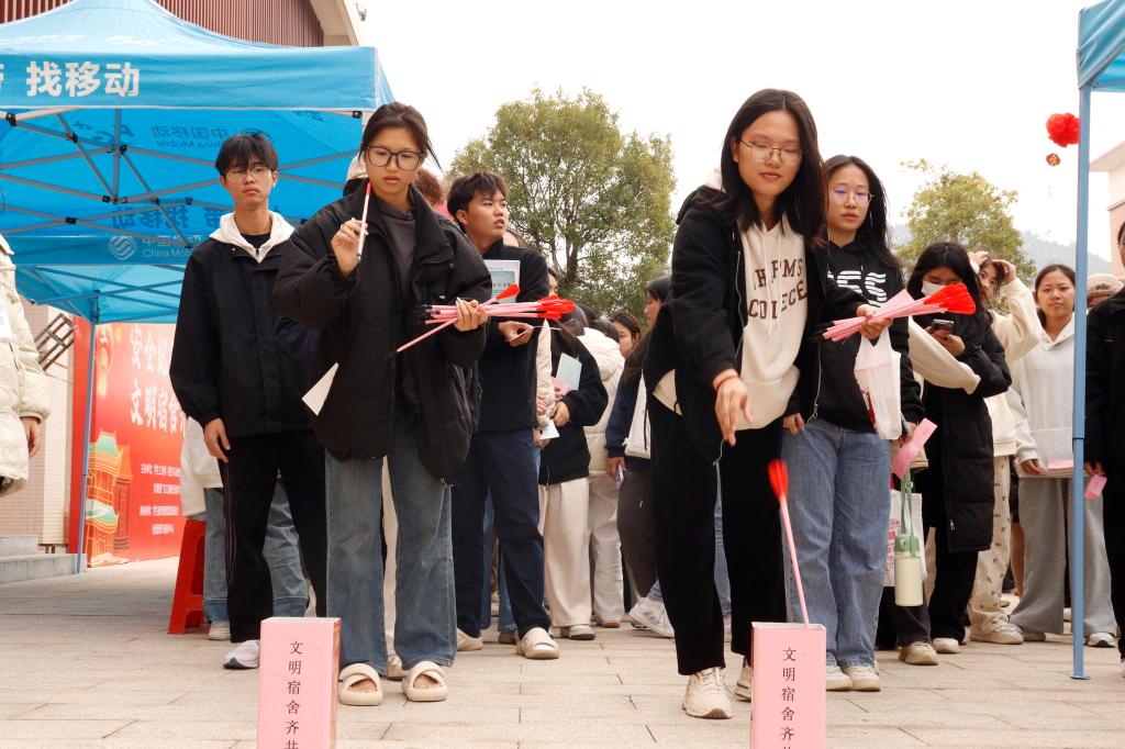 宿舍監(jiān)督委員會的工作人員把守護(hù)宿舍安全的文明標(biāo)語、規(guī)范用電的警示語、危害宿舍和諧的不文明行為藏在字謎里,寫在正確的答案中,畫在紅色的剪紙上,印在豐富的獎品包裝袋。同學(xué)們一邊欣賞中華優(yōu)秀傳統(tǒng)文化,一邊排隊打卡做游戲,將美麗中國與和諧平安宿舍緊密相連,把大國與小家的同榮共辱家國情懷銘記于心,深深刻入腦海。參與活動的同學(xué)們紛紛感嘆道:“從來沒想過,宿舍文化活動還能以這樣的形式開展,這是一場滿含“知識量”的活動,既體驗(yàn)到中華優(yōu)秀傳統(tǒng)文化,了解美麗中國的多姿多彩,又在游園游戲中學(xué)到宿舍紀(jì)律安全知識,真是太開心了!”他們表示,在今后的學(xué)習(xí)生活中,會更加注重日常行為規(guī)范,營造和諧溫馨的宿舍環(huán)境,將個人小我融入國家大我之中,建好“宿舍小家”,努力學(xué)習(xí)知識技能為“祖國大家”貢獻(xiàn)青春力量。
