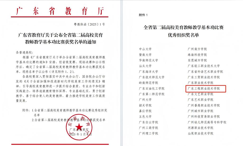 近日,廣東省教育廳發(fā)布了關(guān)于公布全省第二屆高校美育教師教學基本功比賽獲獎名單的通知(粵教體函〔2025〕1號)。我校藝術(shù)設(shè)計學院教師施焦、溫潔蕓、徐諶榕、李源雨獲得一等獎,鄧秀蘭、黃千、鄭玲玲老師獲得二等獎,陳菁暉老師獲得三等獎,共8項省級獎項。學校被授予優(yōu)秀組織獎。