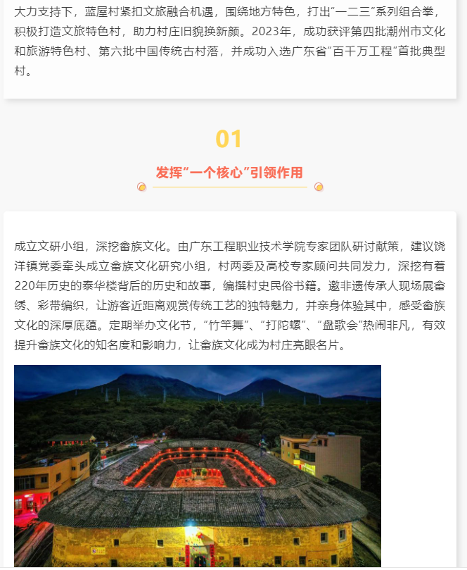 文章高度肯定了我校在地方所做的貢獻,重點闡述了我校通過整合地方政府、鄉(xiāng)村振興及“雙百行動”資源,利用我校藝術(shù)、商務(wù)、文旅等專業(yè)優(yōu)勢,結(jié)合藍屋畬族村作為饒平縣唯一少數(shù)民族聚居村的獨特資源,擴大藍屋畬族村少數(shù)民族文化的對外宣傳,形成獨特少數(shù)民族風(fēng)情的文旅文化。隨著其知名度的提高,越來越多的游客到藍屋畬族村游玩,促進了地方經(jīng)濟的發(fā)展,村集體和村民收入明顯提高。