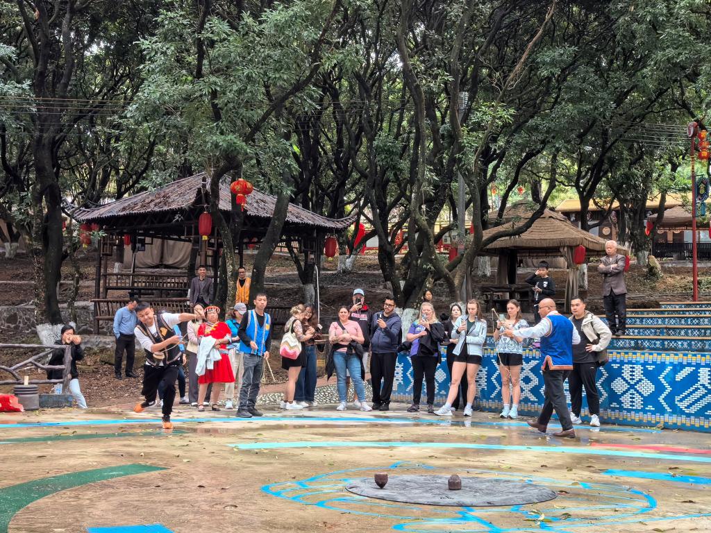 美國(guó)師生欣賞并體驗(yàn)畬族打陀螺