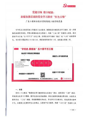 近日,廣東省職業(yè)院校黨建工作優(yōu)秀案例評(píng)選結(jié)果揭曉,我院智能工程學(xué)院黨委申報(bào)的黨建工作案例《黨建引領(lǐng) 數(shù)字賦能:新媒體激活高校黨史學(xué)習(xí)教育“紅色引擎”》成功入選2025年度廣東省職業(yè)院校黨建工作百優(yōu)案例,彰顯了學(xué)院在黨建創(chuàng)新與實(shí)踐中的突出成效,成為我校基層黨建工作的又一重要成果。