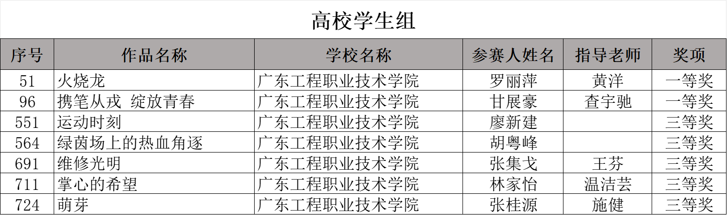 近期,廣東省教育廳辦公室公布2024年廣東省校園攝影大賽獲獎(jiǎng)名單。本次比賽以“青春獻(xiàn)禮 挺膺擔(dān)當(dāng)”為主題,經(jīng)初評(píng)、網(wǎng)絡(luò)展示和投票以及專家、學(xué)者組成的評(píng)審組評(píng)定,我校師生7項(xiàng)作品憑借扎實(shí)技術(shù)及獨(dú)特審美從全省眾多作品中脫穎而出,共斬獲高校學(xué)生組一等獎(jiǎng)2項(xiàng),三等獎(jiǎng)5項(xiàng)。