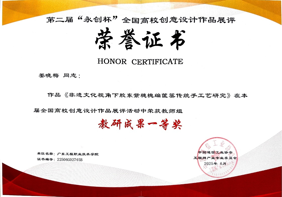 其中,姜曉梅老師的教研成果《非遺文化視角下膠東紫惠槐編筐簍傳統(tǒng)手工藝研究》榮獲教師組教研成果一等獎;黎智宇、林小陽、黃曉峰同學(xué)的作品《愿你成為自己的光》獲學(xué)生組一等獎;余晨瑛同學(xué)《一生的旅程》與蔡慧欣同學(xué)《清肌坊VI設(shè)計》分獲學(xué)生組二等獎;陳嬌霞、朱玟燕、余晨瑛同學(xué)合作的《青風(fēng)瓷韻》以及謝佩橈同學(xué)《廣東醒獅文化互動體驗(yàn)》獲學(xué)生組三等獎。