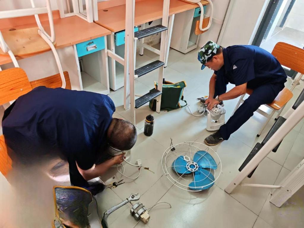 清遠(yuǎn)校區(qū)學(xué)生宿舍1-7棟宿舍利用假期進(jìn)行全面防水補(bǔ)漏和施工,包括對(duì)宿舍風(fēng)扇和空調(diào)清潔,為學(xué)生創(chuàng)造更加舒適、安全的生活環(huán)境。