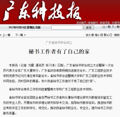 5月24日,《廣東科技報》對我院與暨南大學(xué)聯(lián)合發(fā)起舉行的廣東省秘書學(xué)會成立大會暨第一次會員代表大會進行了報道。