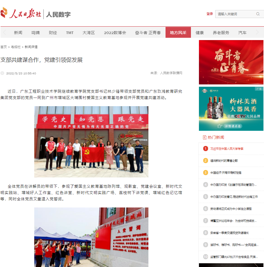 近日,廣東工程職業(yè)技術(shù)學(xué)院繼續(xù)教育學(xué)院黨支部書(shū)記林少鋒帶領(lǐng)支部黨員和廣東玖鴻教育研究集團(tuán)黨支部的黨員一同到廣州市增城區(qū)大埔圍村愛(ài)國(guó)主義教育基地參觀(guān)并開(kāi)展黨建共建活動(dòng)。