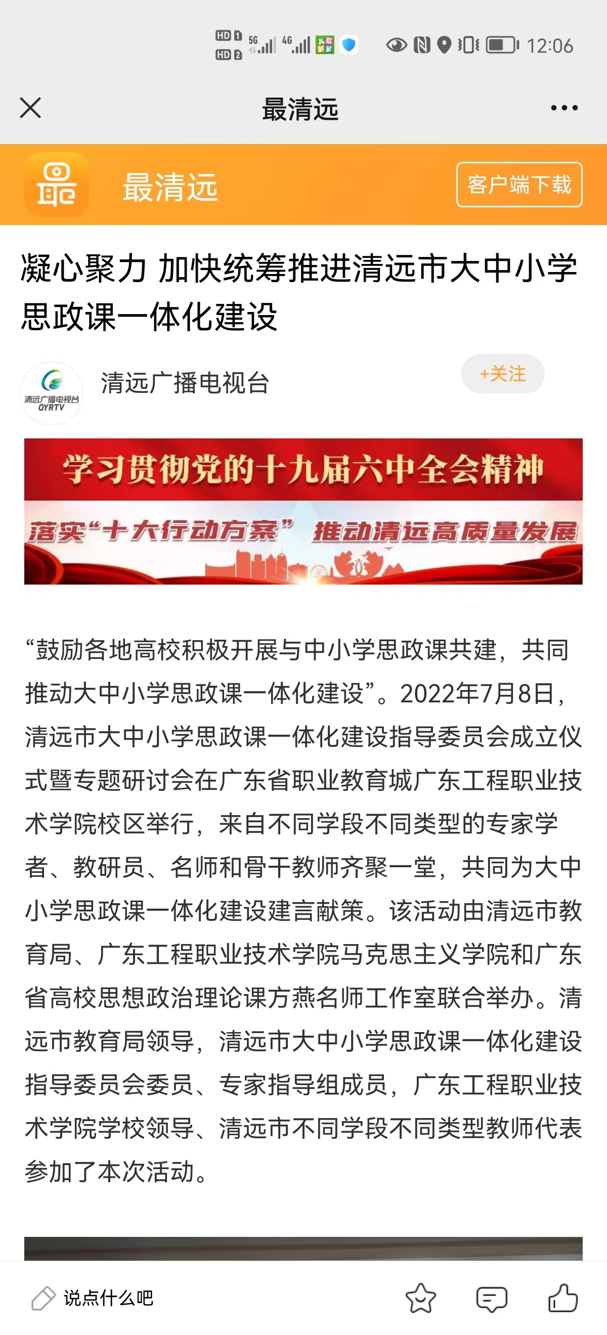 此次大中小學(xué)思政課一體化建設(shè)指導(dǎo)委員會和大中小學(xué)思政課一體化教學(xué)改革創(chuàng)新中心的成立,由清遠(yuǎn)市教育局、廣東工程職業(yè)技術(shù)學(xué)院共同發(fā)起和推進(jìn)。近年來,清遠(yuǎn)市教育局多措并舉,大力推進(jìn)思政教育工作,取得一定的工作成效。如:舉辦思想政治理論課教師培訓(xùn)班,努力提高課堂教學(xué)質(zhì)量;錄制抗疫思政課,組織全市中小學(xué)生進(jìn)行學(xué)習(xí);評選50節(jié)精品思政課,供全市思政教師學(xué)習(xí)、參考;成立10個思政課名師工作室,全面推進(jìn)思政工作;在清城區(qū)和連南縣開展課程思政試點(diǎn)工作,發(fā)揮了輻射和引領(lǐng)示范作用。
