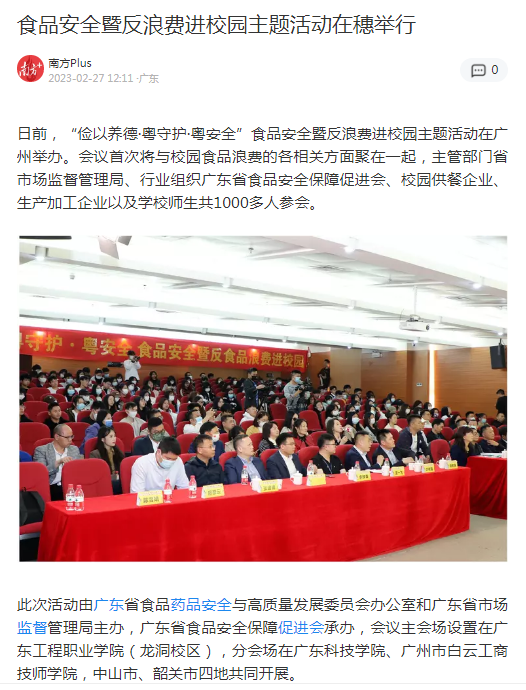 日前,“儉以養(yǎng)德·粵守護(hù)·粵安全”食品安全暨反浪費(fèi)進(jìn)校園主題活動(dòng)在廣州舉辦。會(huì)議首次將與校園食品浪費(fèi)的各相關(guān)方面聚在一起,主管部門(mén)省市場(chǎng)監(jiān)督管理局、行業(yè)組織廣東省食品安全保障促進(jìn)會(huì)、校園供餐企業(yè)、生產(chǎn)加工企業(yè)以及學(xué)校師生共1000多人參會(huì)。
