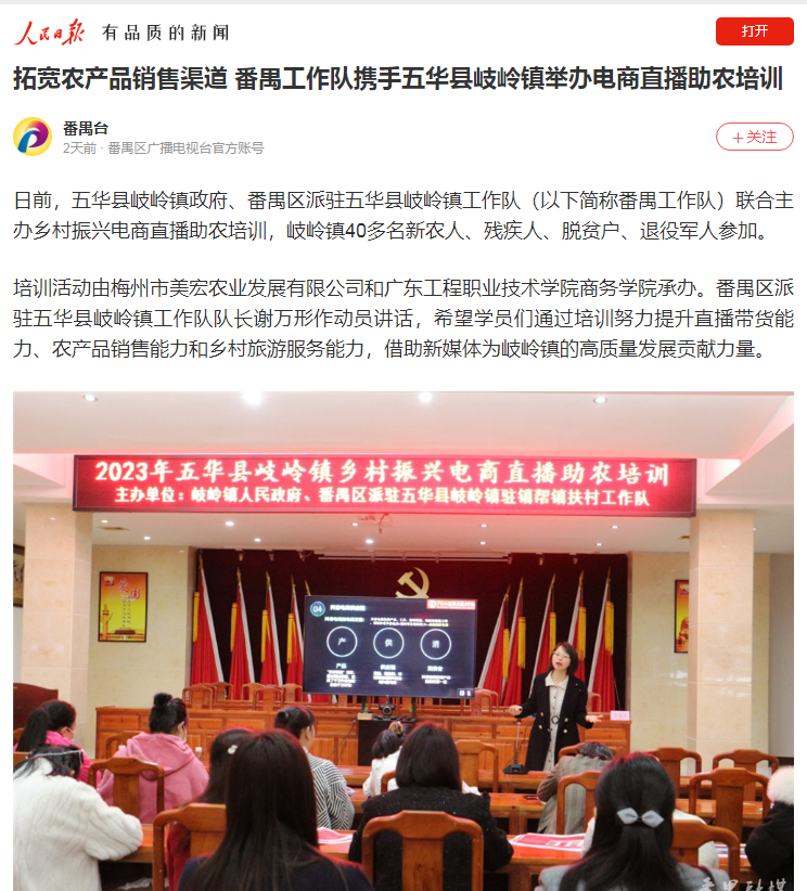 日前,五華縣岐嶺鎮(zhèn)政府、番禺區(qū)派駐五華縣岐嶺鎮(zhèn)工作隊(以下簡稱番禺工作隊)聯(lián)合主辦鄉(xiāng)村振興電商直播助農(nóng)培訓,岐嶺鎮(zhèn)40多名新農(nóng)人、殘疾人、脫貧戶、退役軍人參加。