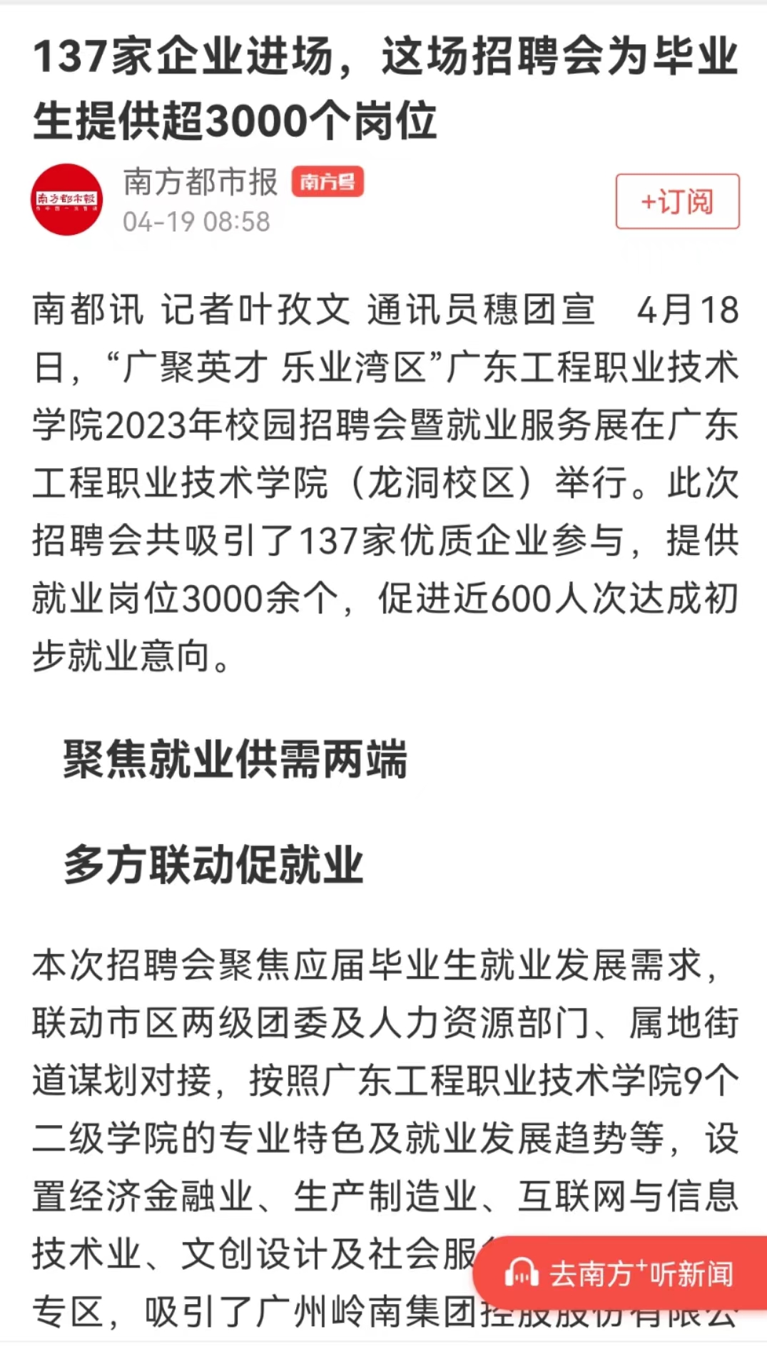 4月18日,“廣聚英才 樂業(yè)灣區(qū)”廣東工程職業(yè)技術(shù)學(xué)院2023年校園招聘會暨就業(yè)服務(wù)展在廣東工程職業(yè)技術(shù)學(xué)院(龍洞校區(qū))舉行。此次招聘會共吸引了137家優(yōu)質(zhì)企業(yè)參與,提供就業(yè)崗位3000余個,促進近600人次達成初步就業(yè)意向。