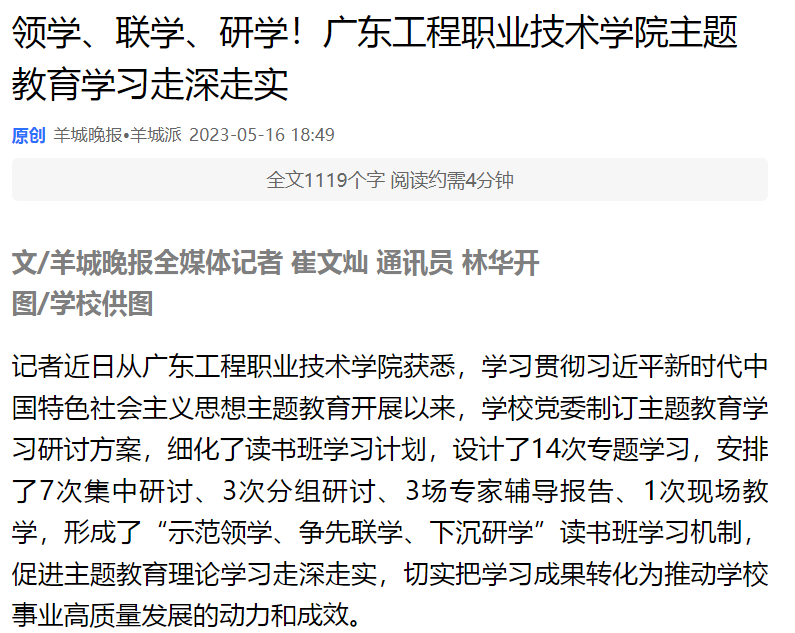 “黨員干部要堅(jiān)持讀原著、學(xué)原文、悟原理,全面學(xué)、深入學(xué),把握學(xué)習(xí)重點(diǎn),以理論上的清醒夯實(shí)政治上的堅(jiān)定,將開(kāi)展好主題教育作為全面貫徹黨的教育方針,落實(shí)立德樹(shù)人根本任務(wù),奮力推進(jìn)‘雙高’校建設(shè)的具體實(shí)踐,為廣東高質(zhì)量發(fā)展貢獻(xiàn)教育力量。”學(xué)校黨委書記吳琦琳在讀書班開(kāi)班式上強(qiáng)調(diào)。