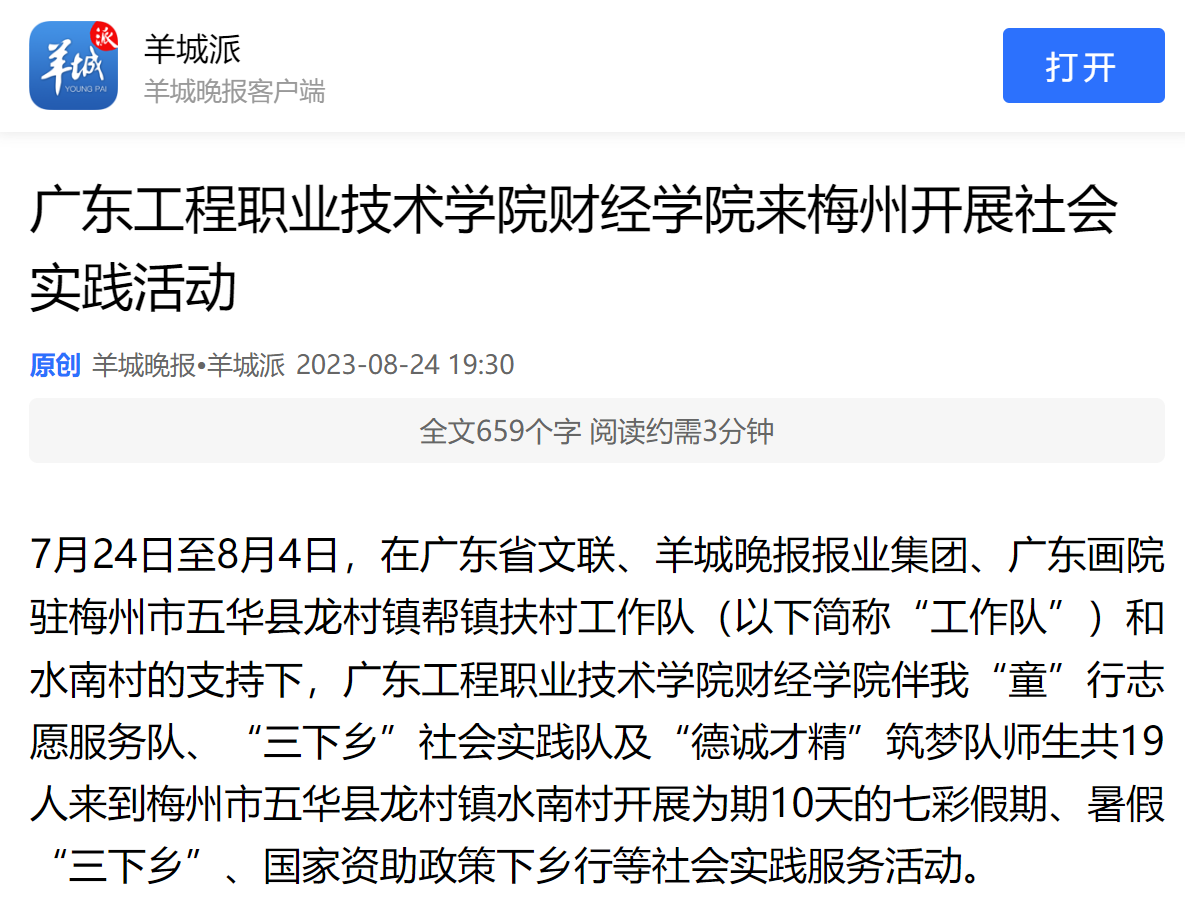 7月24日至8月4日,在廣東省文聯(lián)、羊城晚報(bào)報(bào)業(yè)集團(tuán)、廣東畫院駐梅州市五華縣龍村鎮(zhèn)幫鎮(zhèn)扶村工作隊(duì)(以下簡稱“工作隊(duì)”)和水南村的支持下,廣東工程職業(yè)技術(shù)學(xué)院財(cái)經(jīng)學(xué)院伴我“童”行志愿服務(wù)隊(duì)、“三下鄉(xiāng)”社會實(shí)踐隊(duì)及“德誠才精”筑夢隊(duì)師生共19人來到梅州市五華縣龍村鎮(zhèn)水南村開展為期10天的七彩假期、暑假“三下鄉(xiāng)”、國家資助政策下鄉(xiāng)行等社會實(shí)踐服務(wù)活動。