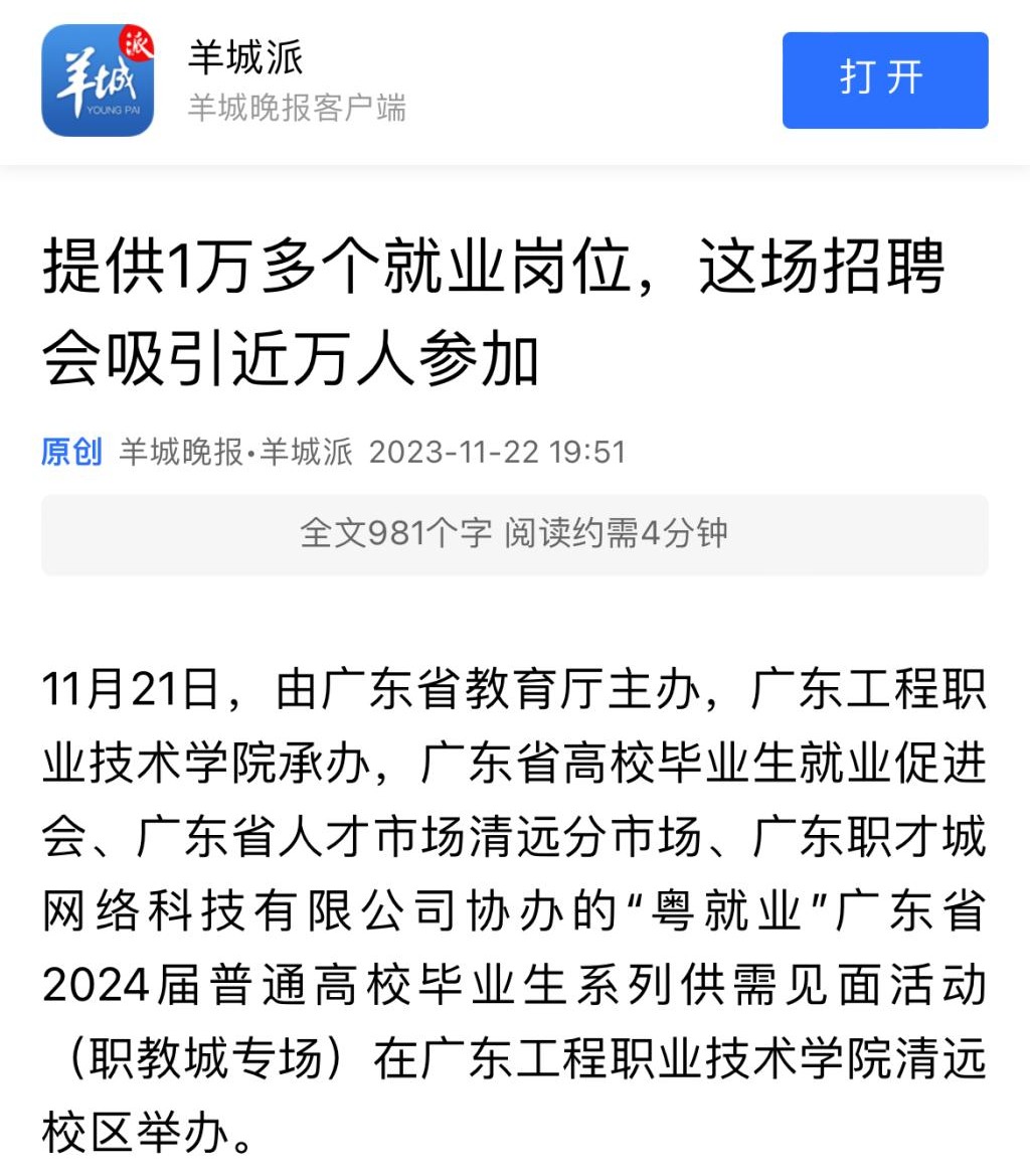 11月21日,由廣東省教育廳主辦,廣東工程職業(yè)技術學院承辦,廣東省高校畢業(yè)生就業(yè)促進會、廣東省人才市場清遠分市場、廣東職才城網(wǎng)絡科技有限公司協(xié)辦的“粵就業(yè)”廣東省2024屆普通高校畢業(yè)生系列供需見面活動(職教城專場)在廣東工程職業(yè)技術學院清遠校區(qū)舉辦。