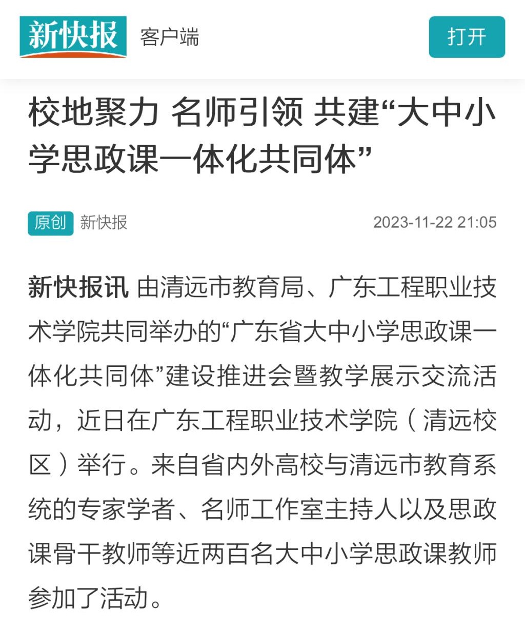 據(jù)介紹,廣東工程職業(yè)技術(shù)學(xué)院作為牽頭高校,與清遠(yuǎn)市教育局校地共建大中小學(xué)思政課一體化共同體項(xiàng)目,旨在通過(guò)發(fā)揮和整合省內(nèi)外專(zhuān)家學(xué)者和清遠(yuǎn)市各級(jí)學(xué)校教研員、思政課名師的力量,加強(qiáng)對(duì)廣東省特別是清遠(yuǎn)市大中小學(xué)思政課一體化建設(shè)的研究、指導(dǎo)和服務(wù),切實(shí)打造市域特色的大中小學(xué)思政課一體化共同體。