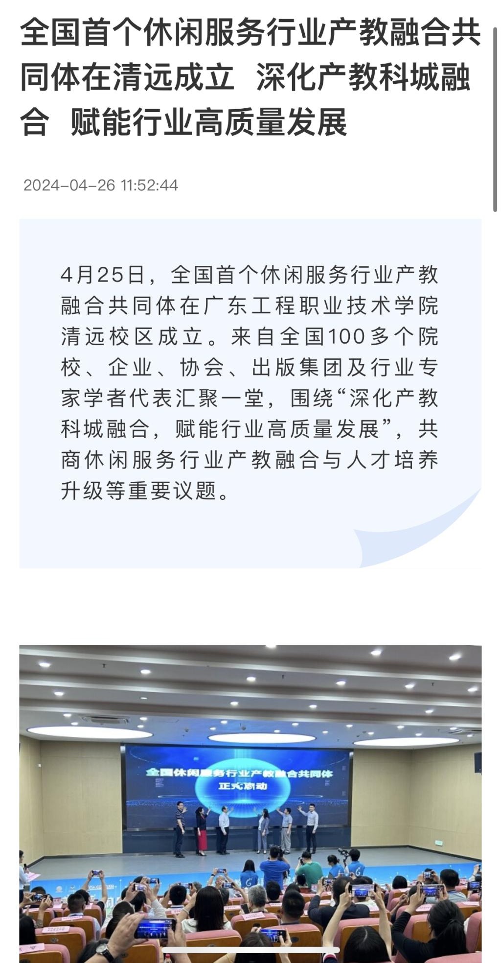 4月25日,全國(guó)首個(gè)休閑服務(wù)行業(yè)產(chǎn)教融合共同體在廣東工程職業(yè)技術(shù)學(xué)院清遠(yuǎn)校區(qū)成立。來自全國(guó)100多個(gè)院校、企業(yè)、協(xié)會(huì)、出版集團(tuán)及行業(yè)專家學(xué)者代表匯聚一堂,圍繞“深化產(chǎn)教科城融合,賦能行業(yè)高質(zhì)量發(fā)展”,共商休閑服務(wù)行業(yè)產(chǎn)教融合與人才培養(yǎng)升級(jí)等重要議題。
