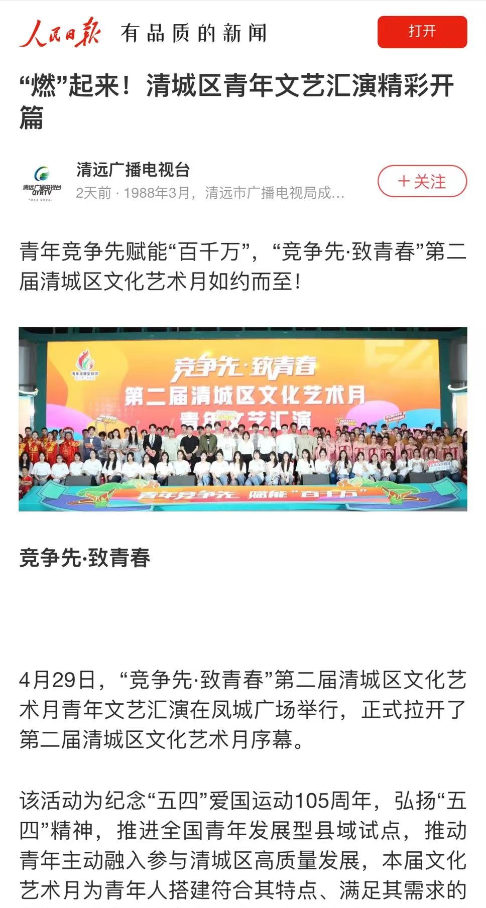 4月29日,“競(jìng)爭(zhēng)先·致青春”第二屆清城區(qū)文化藝術(shù)月青年文藝匯演在鳳城廣場(chǎng)舉行,正式拉開了第二屆清城區(qū)文化藝術(shù)月序幕。