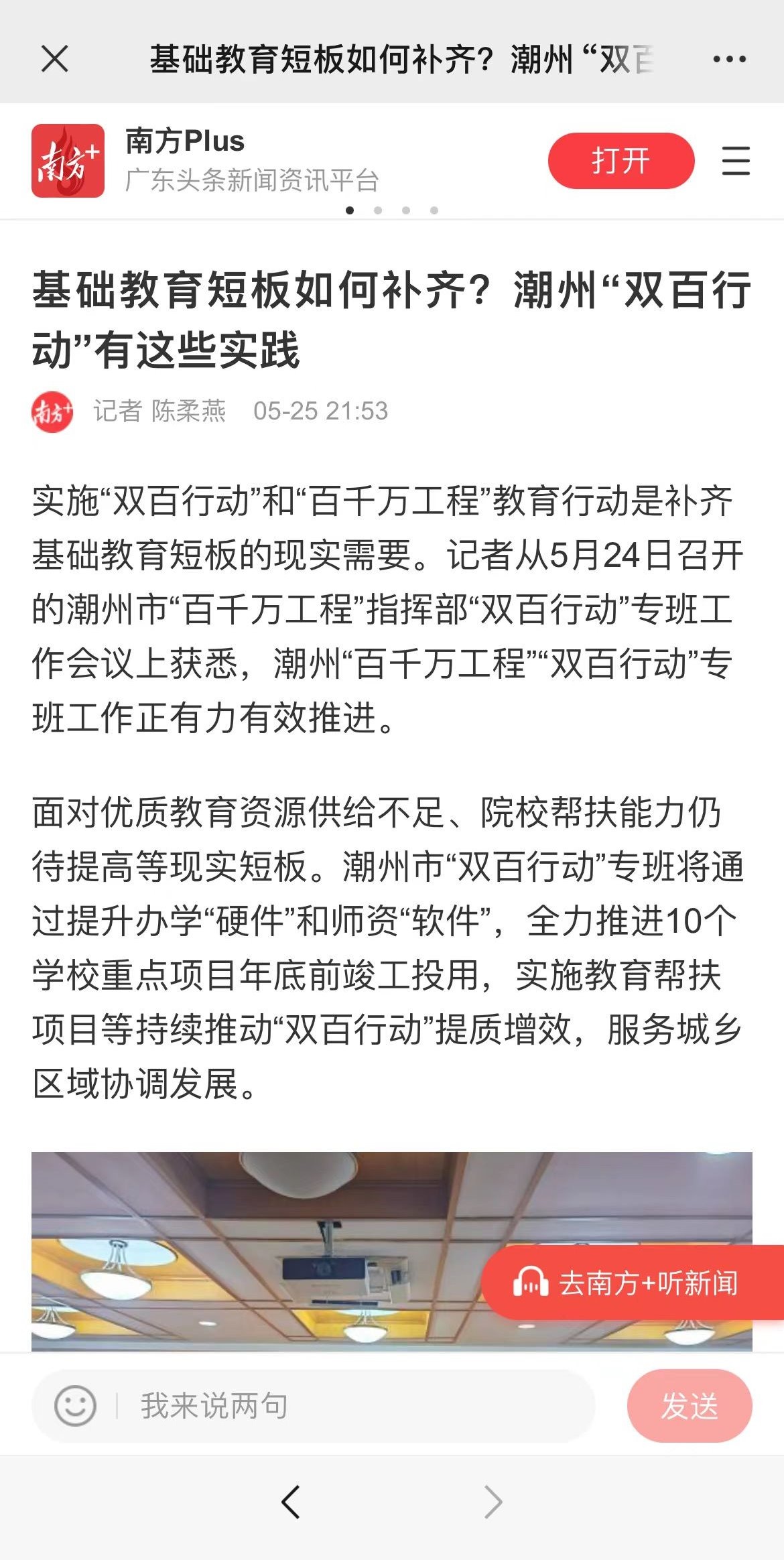 實施“雙百行動”和“百千萬工程”教育行動是補(bǔ)齊基礎(chǔ)教育短板的現(xiàn)實需要。記者從5月24日召開的潮州市“百千萬工程”指揮部“雙百行動”專班工作會議上獲悉,潮州“百千萬工程”“雙百行動”專班工作正有力有效推進(jìn)。