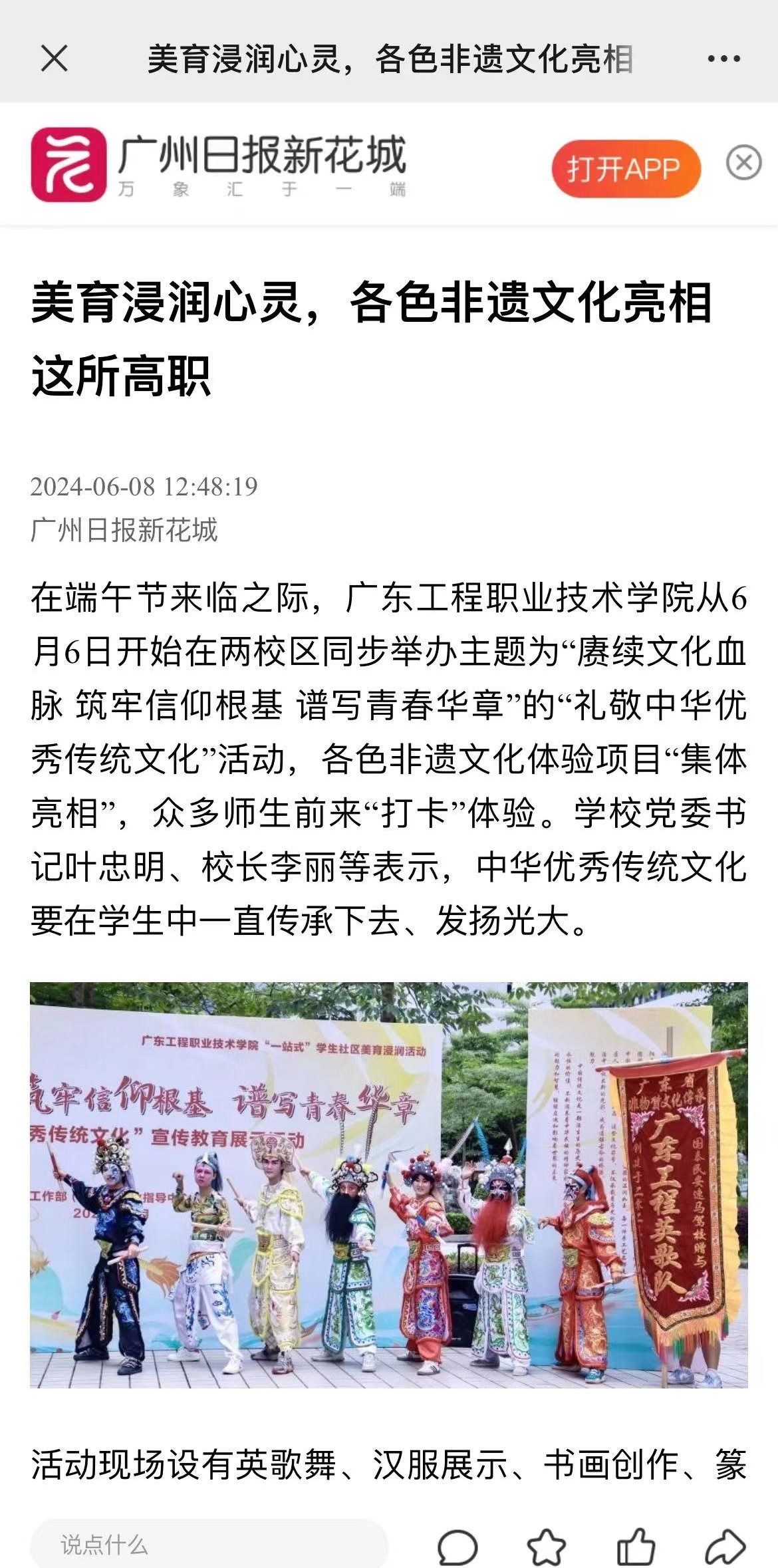 廣東工程職業(yè)技術(shù)學院有關(guān)負責人表示,將繼續(xù)建立健全以中華優(yōu)秀傳統(tǒng)文化為主要內(nèi)容的美育素質(zhì)課程體系,將中華優(yōu)秀傳統(tǒng)文化融入學生社區(qū),努力培養(yǎng)德智體美勞全面發(fā)展的時代新人。