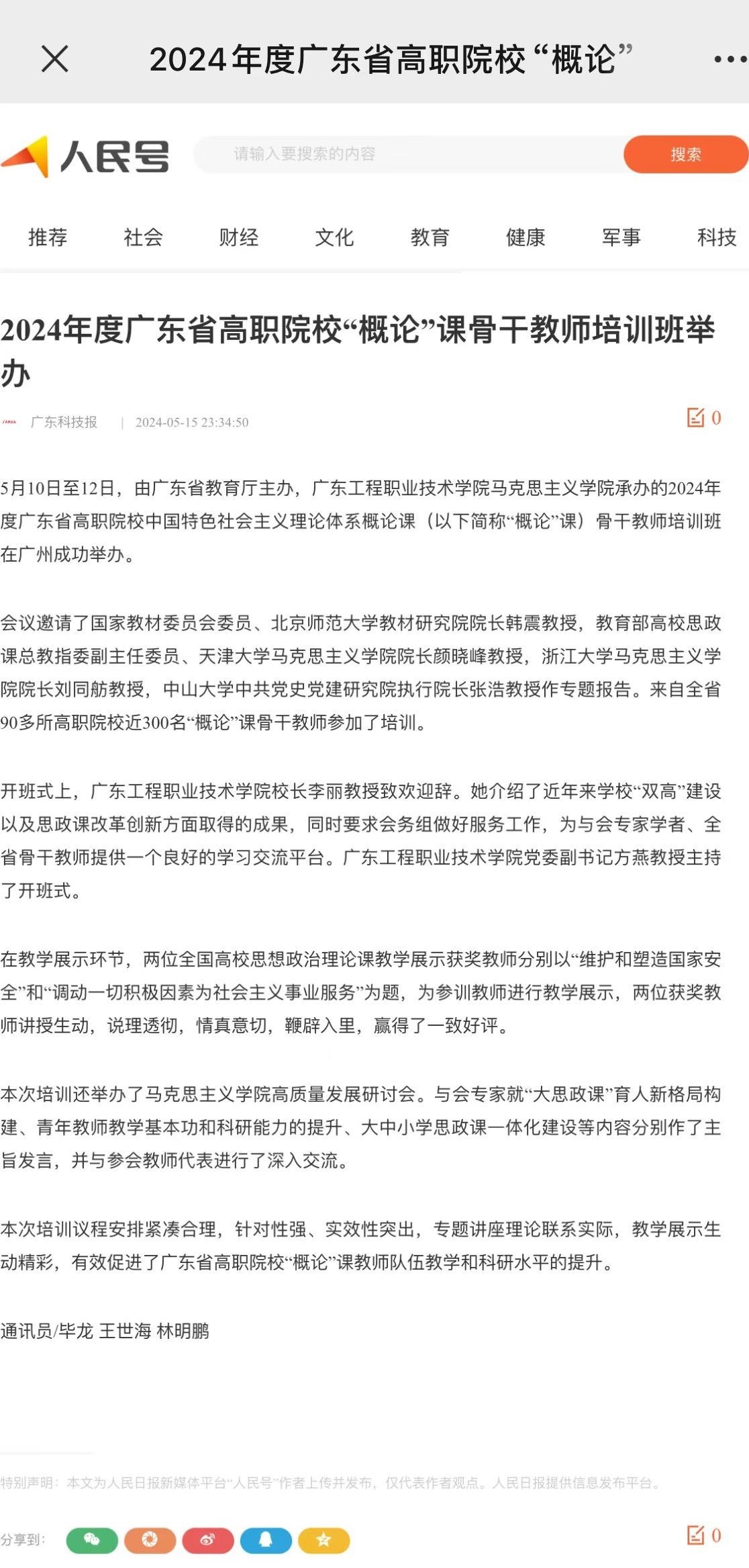 5月10日至12日,由廣東省教育廳主辦,廣東工程職業(yè)技術(shù)學院馬克思主義學院承辦的2024年度廣東省高職院校中國特色社會主義理論體系概論課(以下簡稱“概論”課)骨干教師培訓班在廣州成功舉辦。
