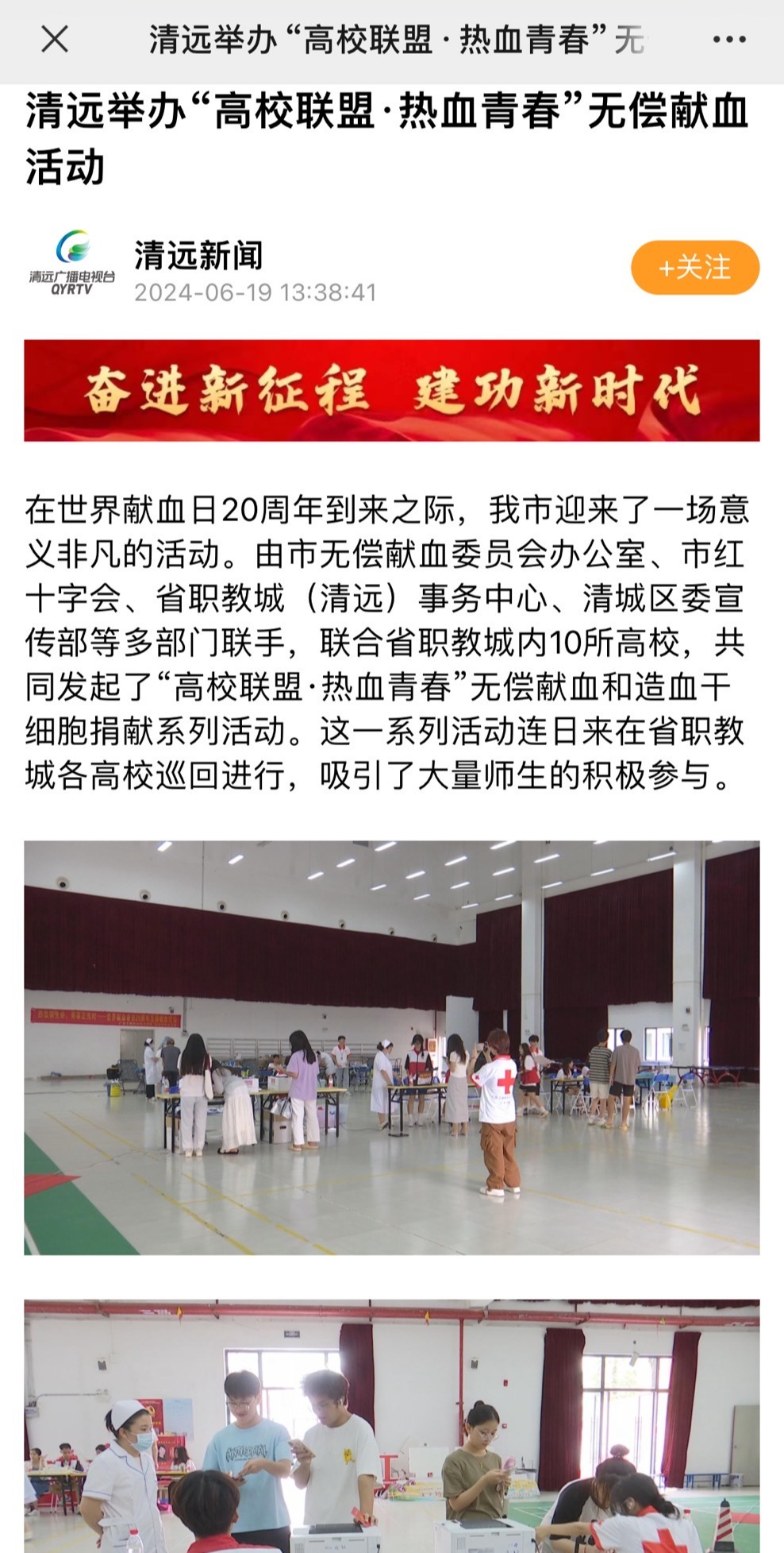 在世界獻(xiàn)血日20周年到來之際,我市迎來了一場(chǎng)意義非凡的活動(dòng)。由市無償獻(xiàn)血委員會(huì)辦公室、市紅十字會(huì)、省職教城(清遠(yuǎn))事務(wù)中心、清城區(qū)委宣傳部等多部門聯(lián)手,聯(lián)合省職教城內(nèi)10所高校,共同發(fā)起了“高校聯(lián)盟·熱血青春”無償獻(xiàn)血和造血干細(xì)胞捐獻(xiàn)系列活動(dòng)。這一系列活動(dòng)連日來在省職教城各高校巡回進(jìn)行,吸引了大量師生的積極參與。