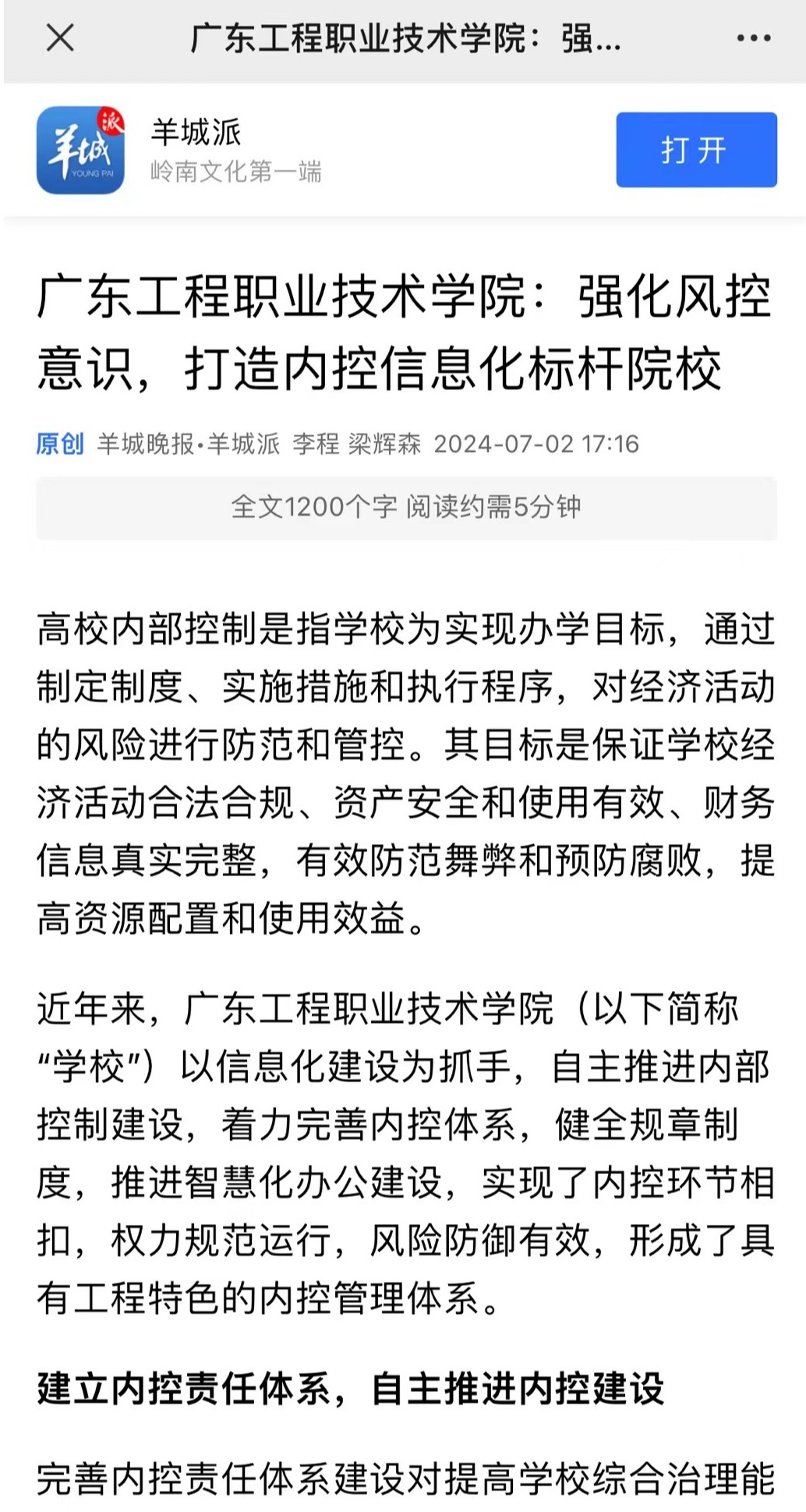 近年來(lái),廣東工程職業(yè)技術(shù)學(xué)院(以下簡(jiǎn)稱“學(xué)校”)以信息化建設(shè)為抓手,自主推進(jìn)內(nèi)部控制建設(shè),著力完善內(nèi)控體系,健全規(guī)章制度,推進(jìn)智慧化辦公建設(shè),實(shí)現(xiàn)了內(nèi)控環(huán)節(jié)相扣,權(quán)力規(guī)范運(yùn)行,風(fēng)險(xiǎn)防御有效,形成了具有工程特色的內(nèi)控管理體系。