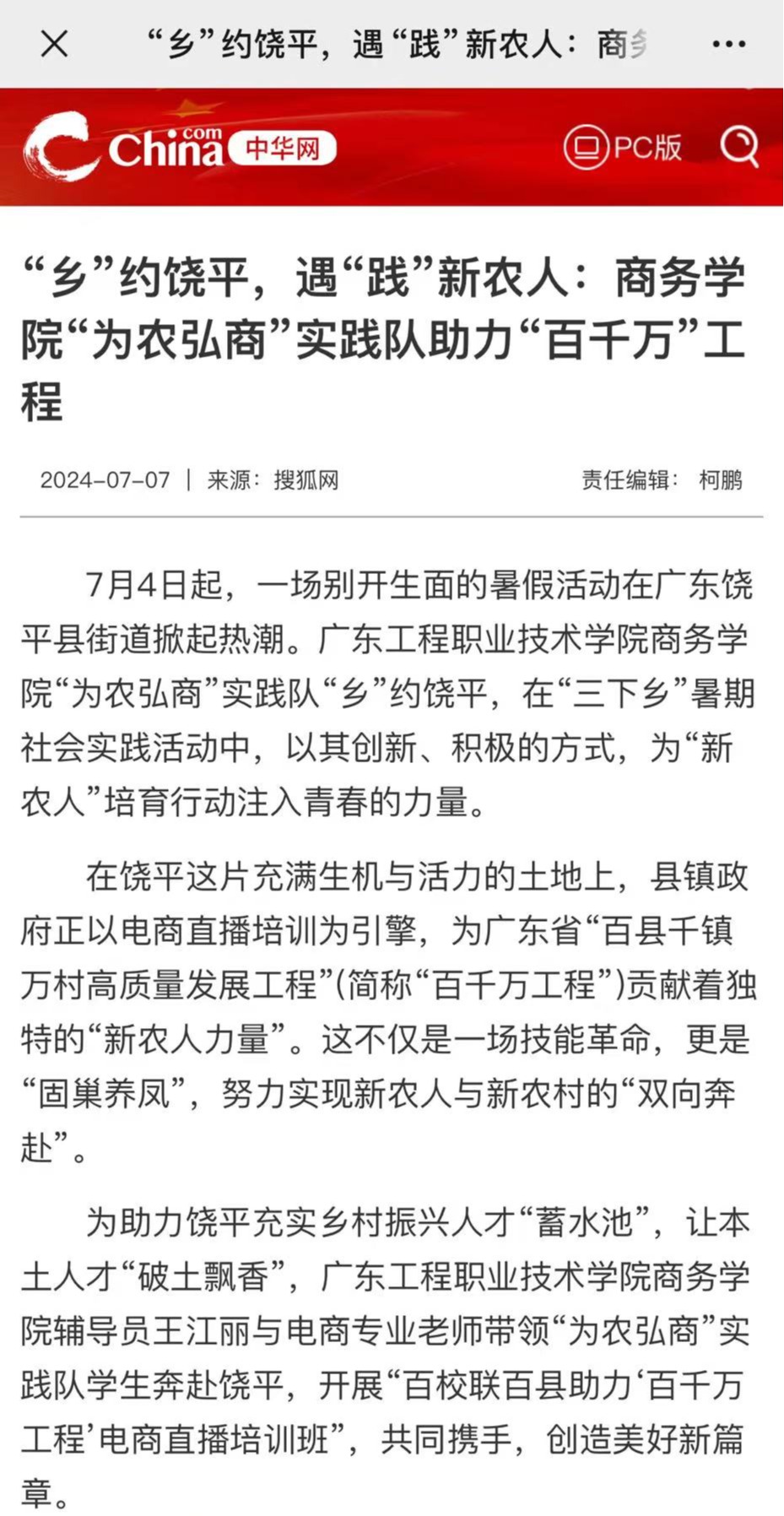 7月4日起,一場(chǎng)別開(kāi)生面的暑假活動(dòng)在廣東饒平縣街道掀起熱潮。廣東工程職業(yè)技術(shù)學(xué)院商務(wù)學(xué)院“為農(nóng)弘商”實(shí)踐隊(duì)“鄉(xiāng)”約饒平,在“三下鄉(xiāng)”暑期社會(huì)實(shí)踐活動(dòng)中,以其創(chuàng)新、積極的方式,為“新農(nóng)人”培育行動(dòng)注入青春的力量。