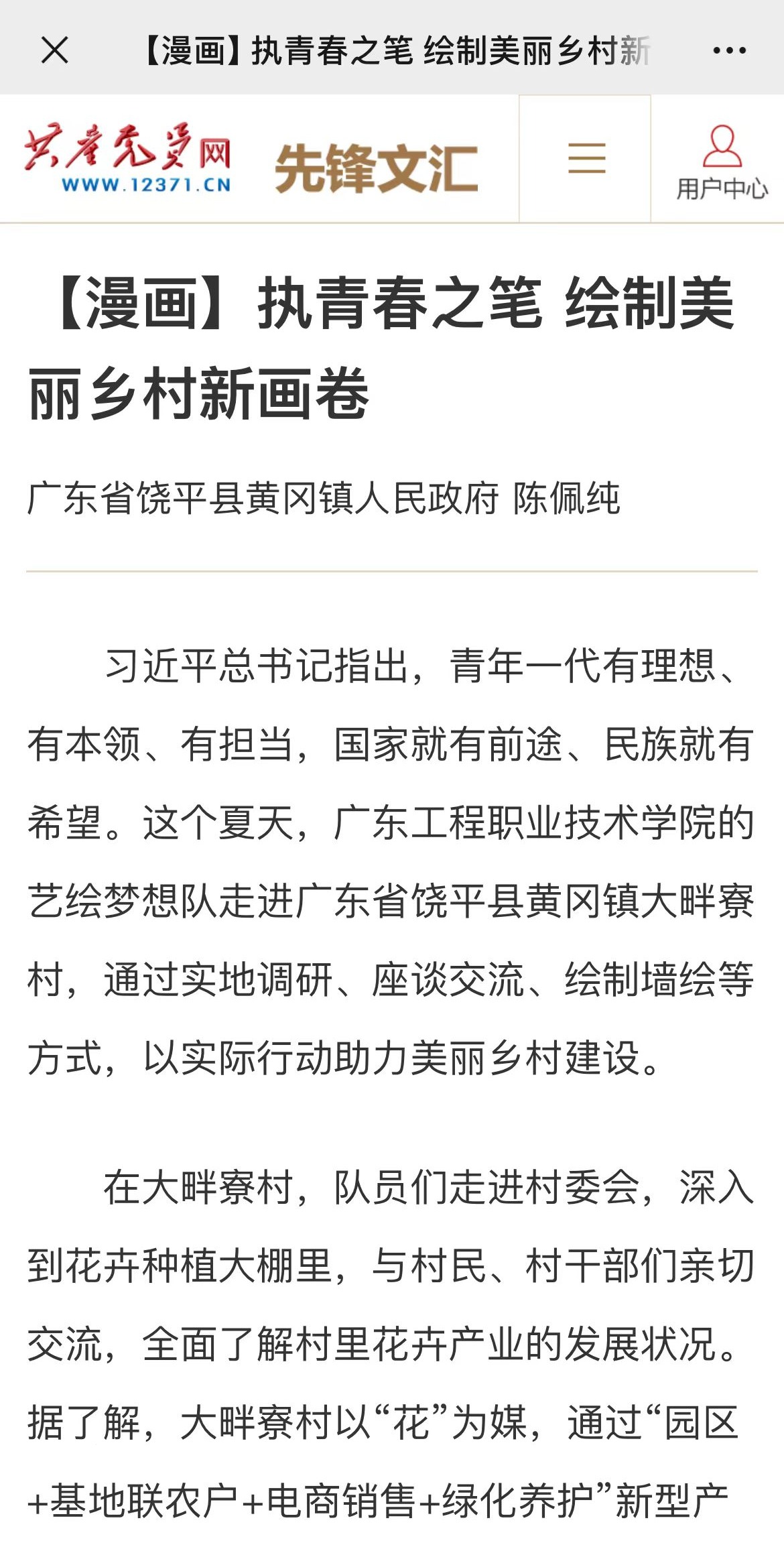 習(xí)近平總書(shū)記指出,青年一代有理想、有本領(lǐng)、有擔(dān)當(dāng),國(guó)家就有前途、民族就有希望。這個(gè)夏天,廣東工程職業(yè)技術(shù)學(xué)院的藝?yán)L夢(mèng)想隊(duì)走進(jìn)廣東省饒平縣黃岡鎮(zhèn)大畔寮村,通過(guò)實(shí)地調(diào)研、座談交流、繪制墻繪等方式,以實(shí)際行動(dòng)助力美麗鄉(xiāng)村建設(shè)。